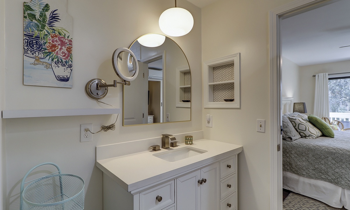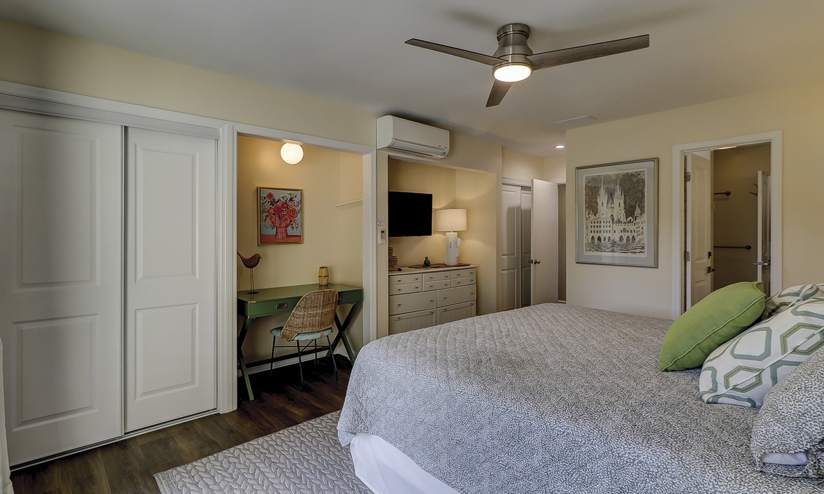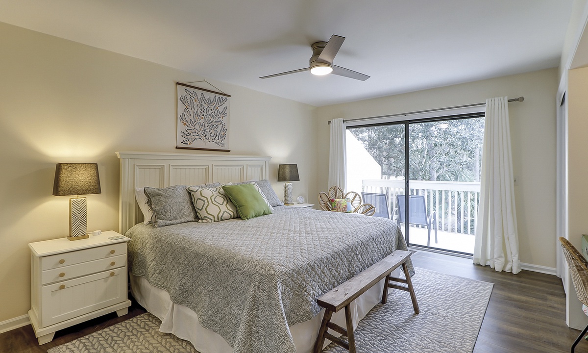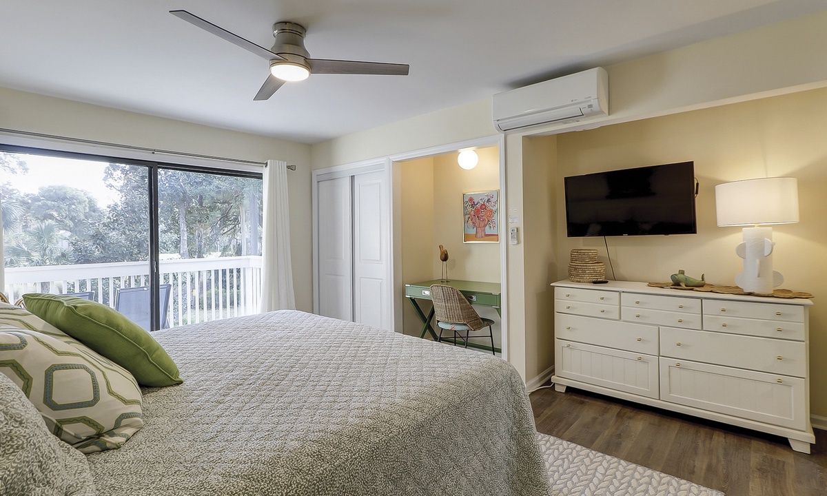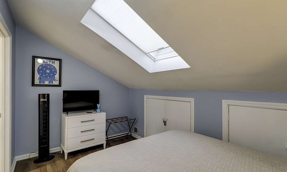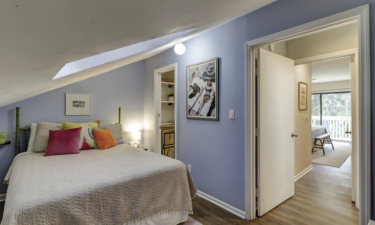 The second level feature another king bedroom with a Smart TV, private balcony overlooking the golf course and lagoon, as well as a renovated bathroom with a tub/shower combination. This room has a minisplit hvac/heating system for adding comfort. The 4th room is a perfect kid's nook with a queen bed, Smart TV and skylight. This room shares access to the king bedroom bathroom .