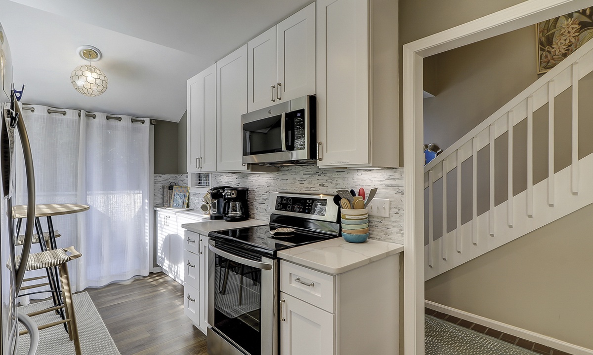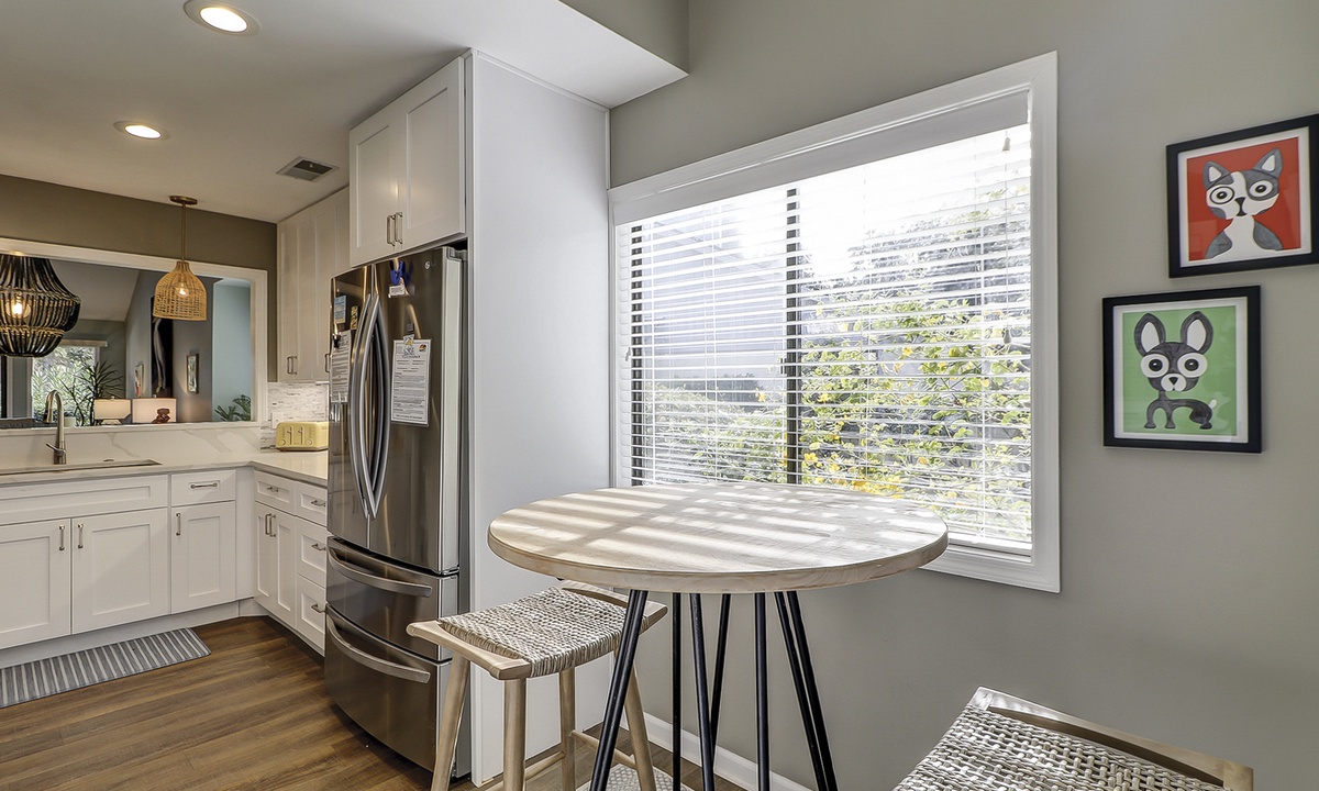 Just off the kitchen is a dining area, with additional dining space in the kitchen breakfast area. The fully renovated kitchen offers marble counters, stainless appliances, plenty of cabinet space and a separate laundry area.