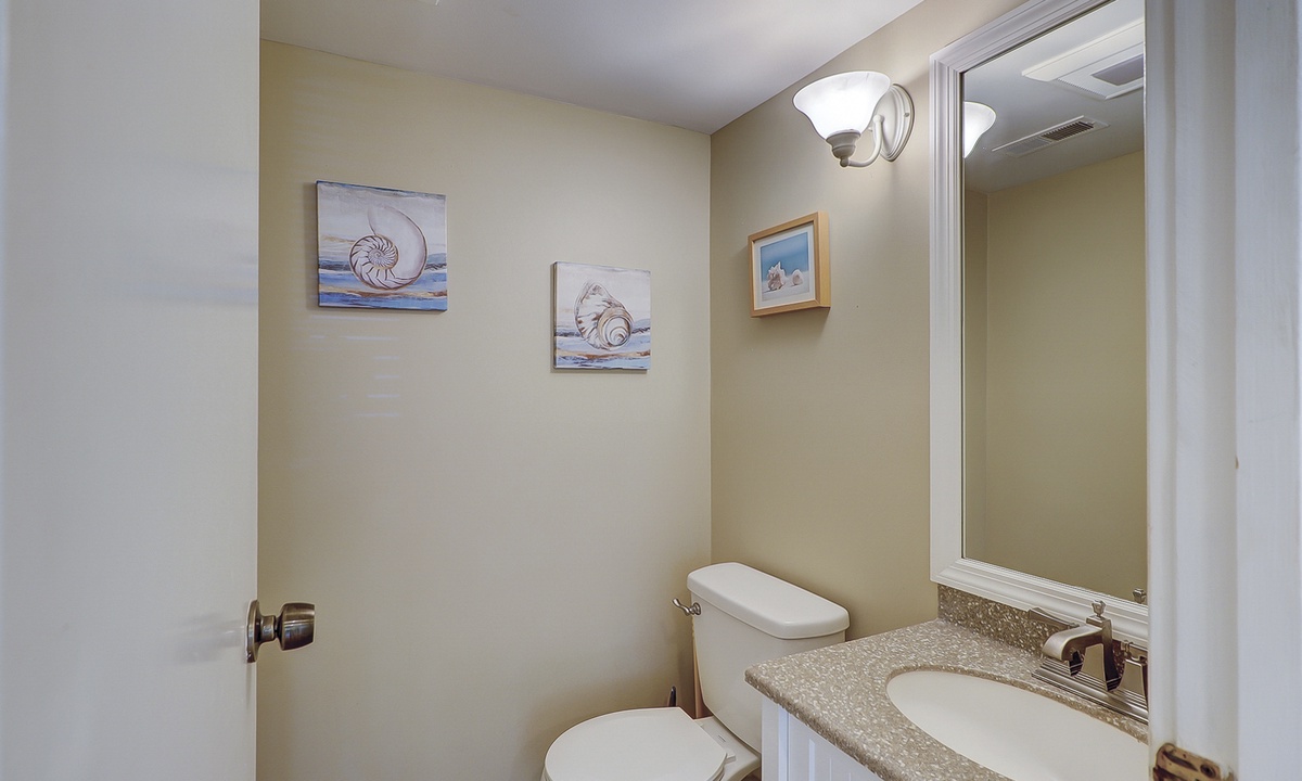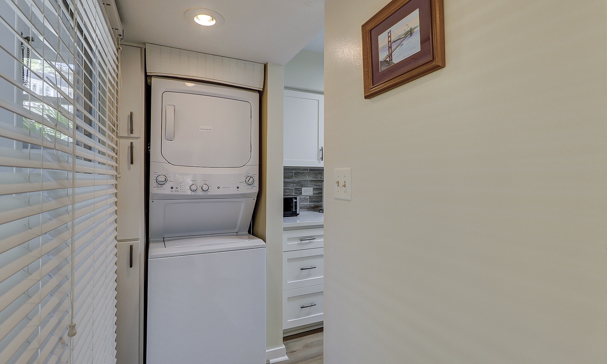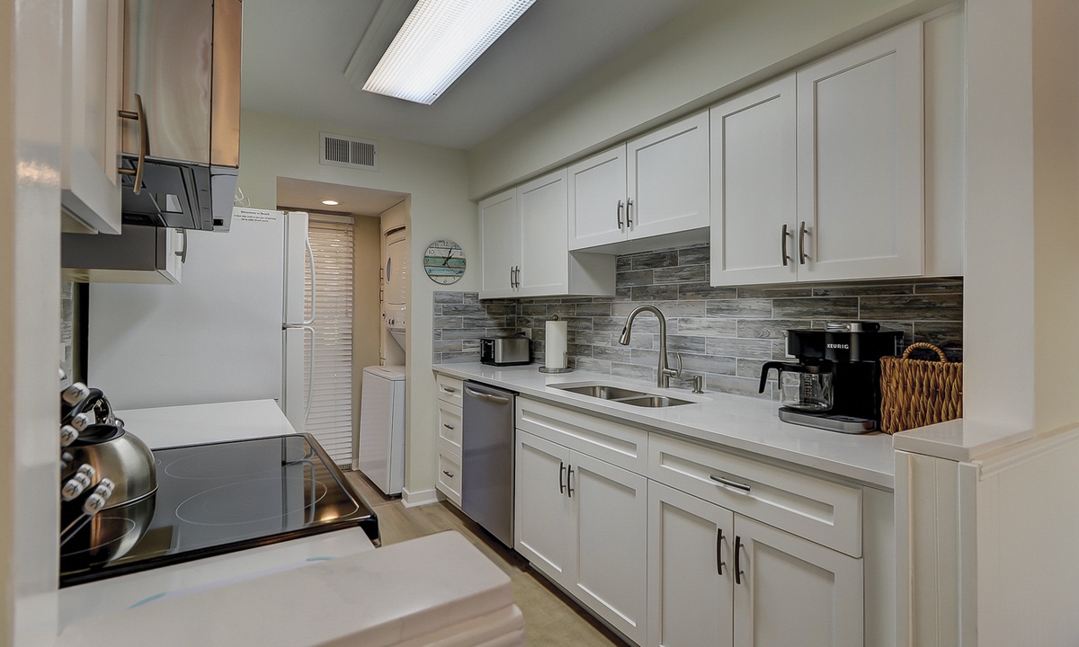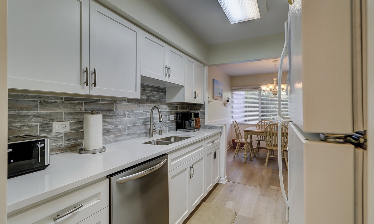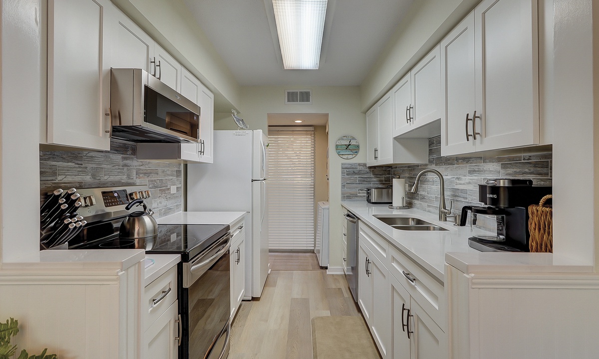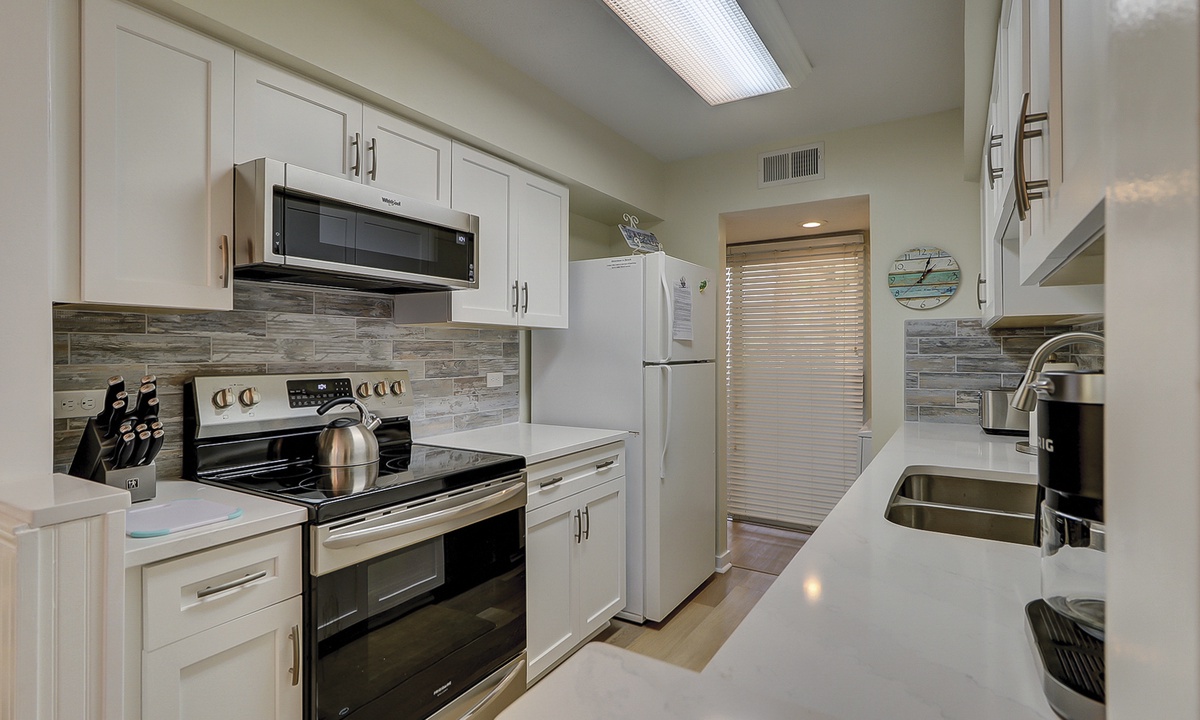 The living area features comfortable furnishings with a sleeper sofa and loveseat, as well as a flat screen TV. The dining area seats 6 comfortably and is open to the galley kitchen. The kitchen has been recently renovated with new cabinetry, stainless steel appliances and is equipped with everything you'll need to prepare a meal for your guests.