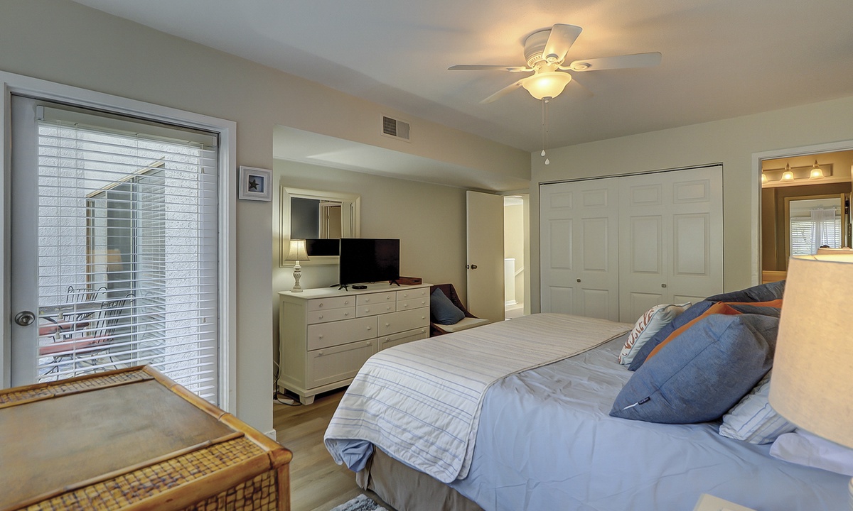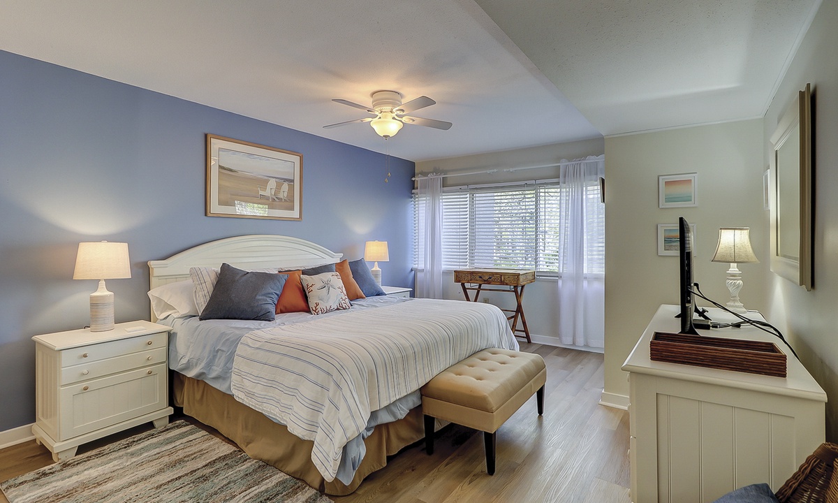 Both bedrooms are on the second level. The primary bedroom features a king bed, flat screen TV and a private bathroom. The guest bedroom features a queen bed and a flat screen TV. This room has access to a hall bathroom with a tub/shower combination.