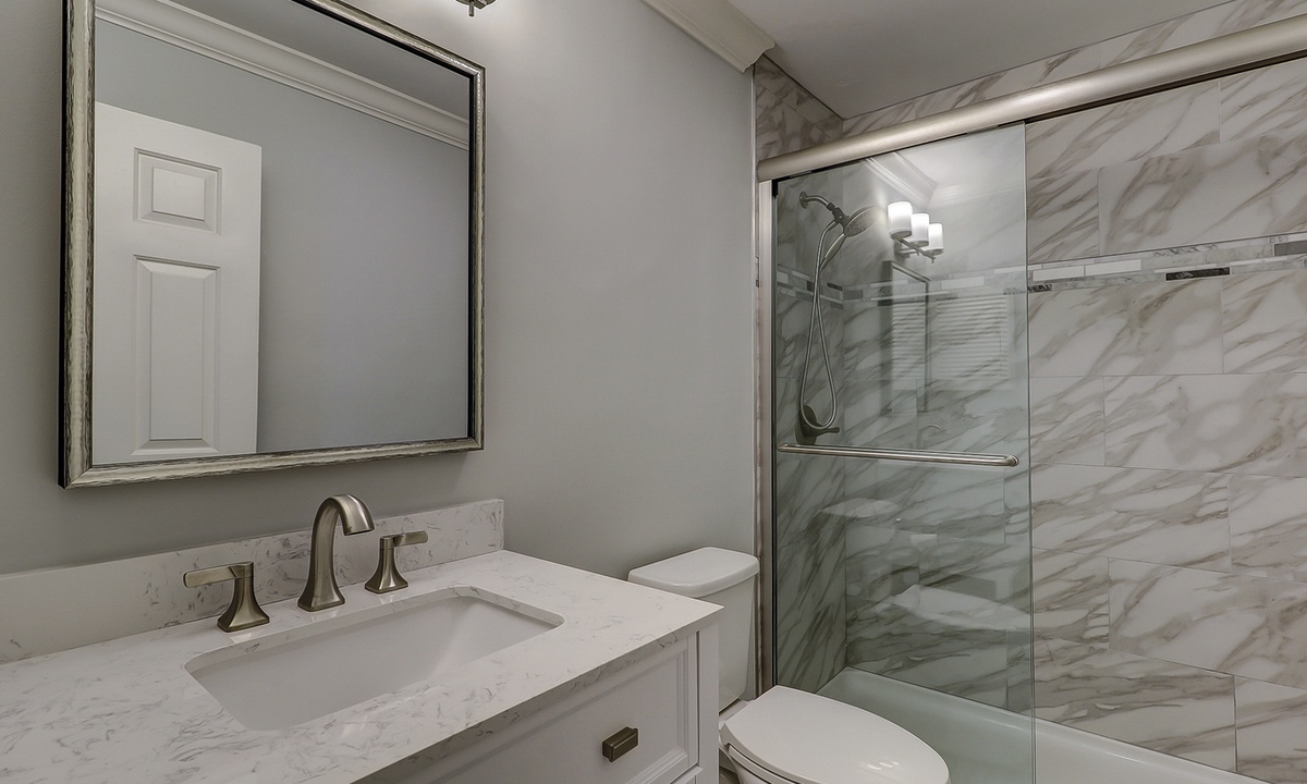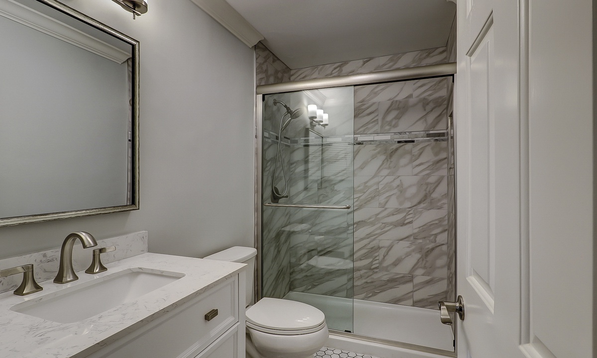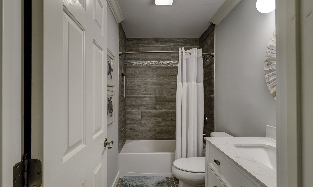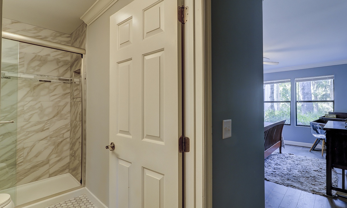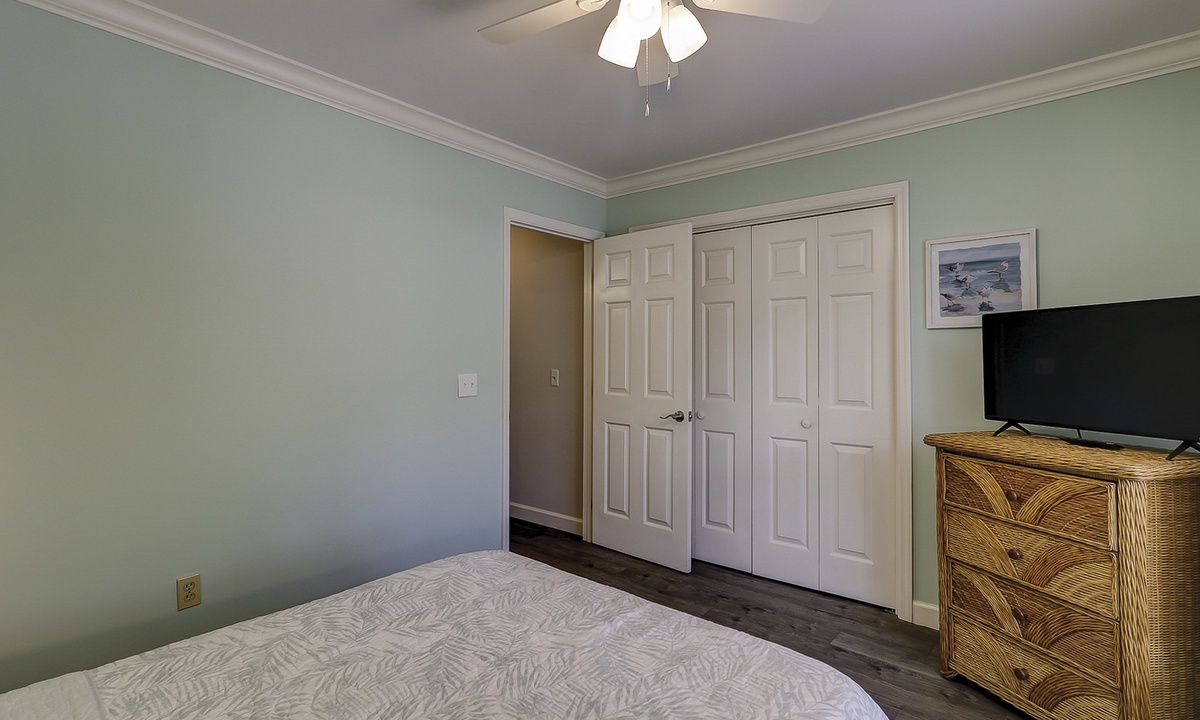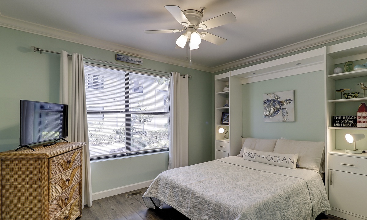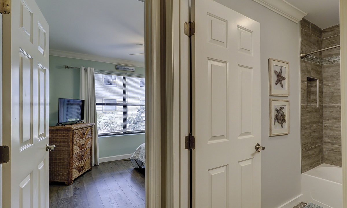 The main bedroom features a king bed, a smart TV to watch your favorite shows, a designated workspace, and a private bathroom. The beautiful bathroom features a tiled walk-in shower, vanity with a granite top, and hair dryer for your convenience. The guest bedroom features a queen bed, surrounded by built-in cabinets, a convenient smart TV, and access to a hall bathroom. The hall bath features a tub/shower combination, a vanity with a granite top, and a hair dryer as well.