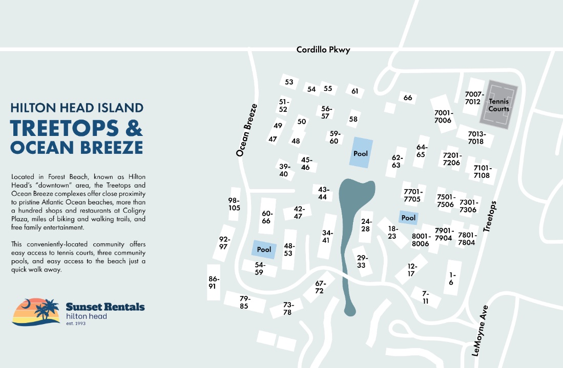 Guests of Ocean Breeze and Treetops, Hilton Head have access to complex tennis courts and 3 complex pools. You’re also just a short walk or bike ride away from the beach and Coligny plaza, which features shops, dining and entertainment!