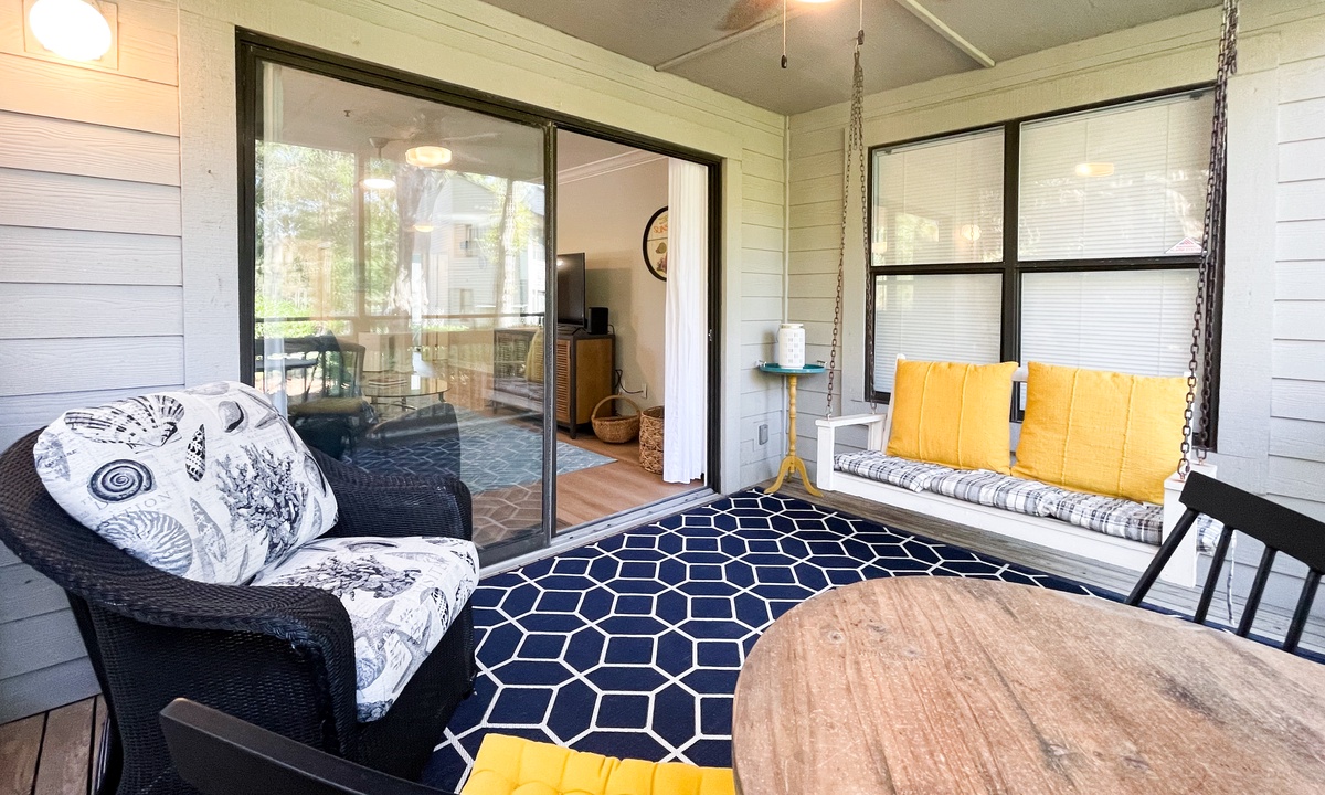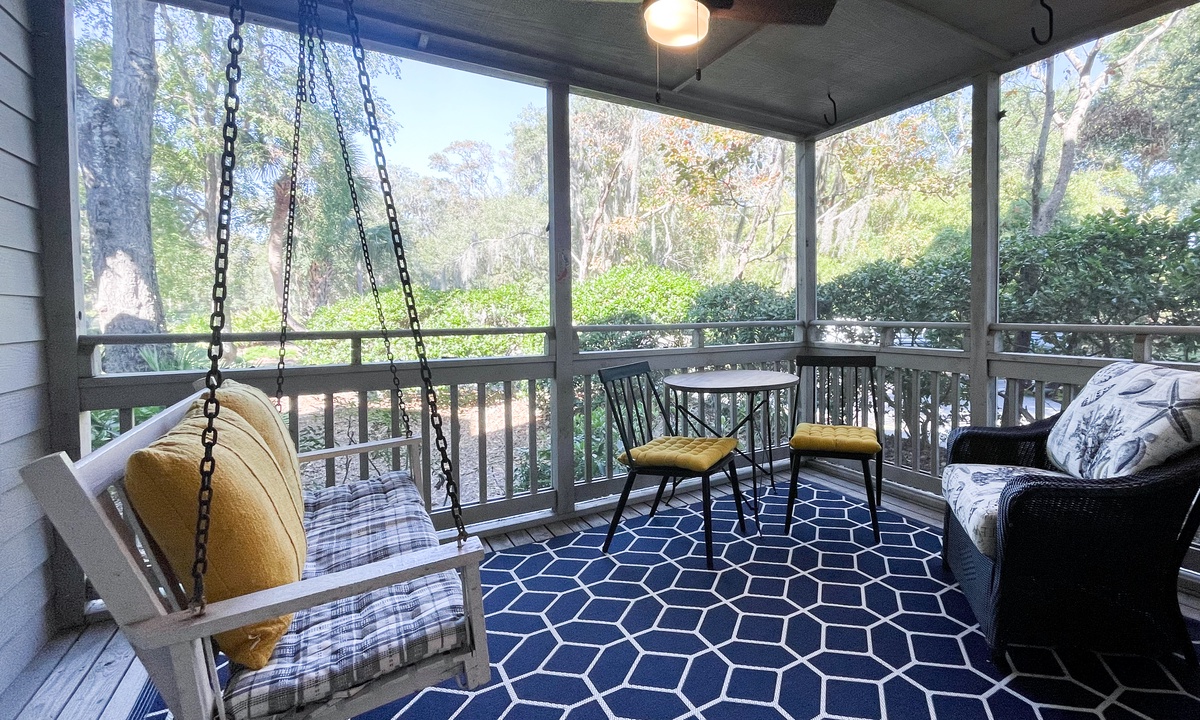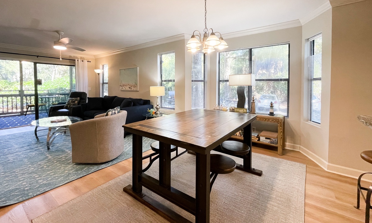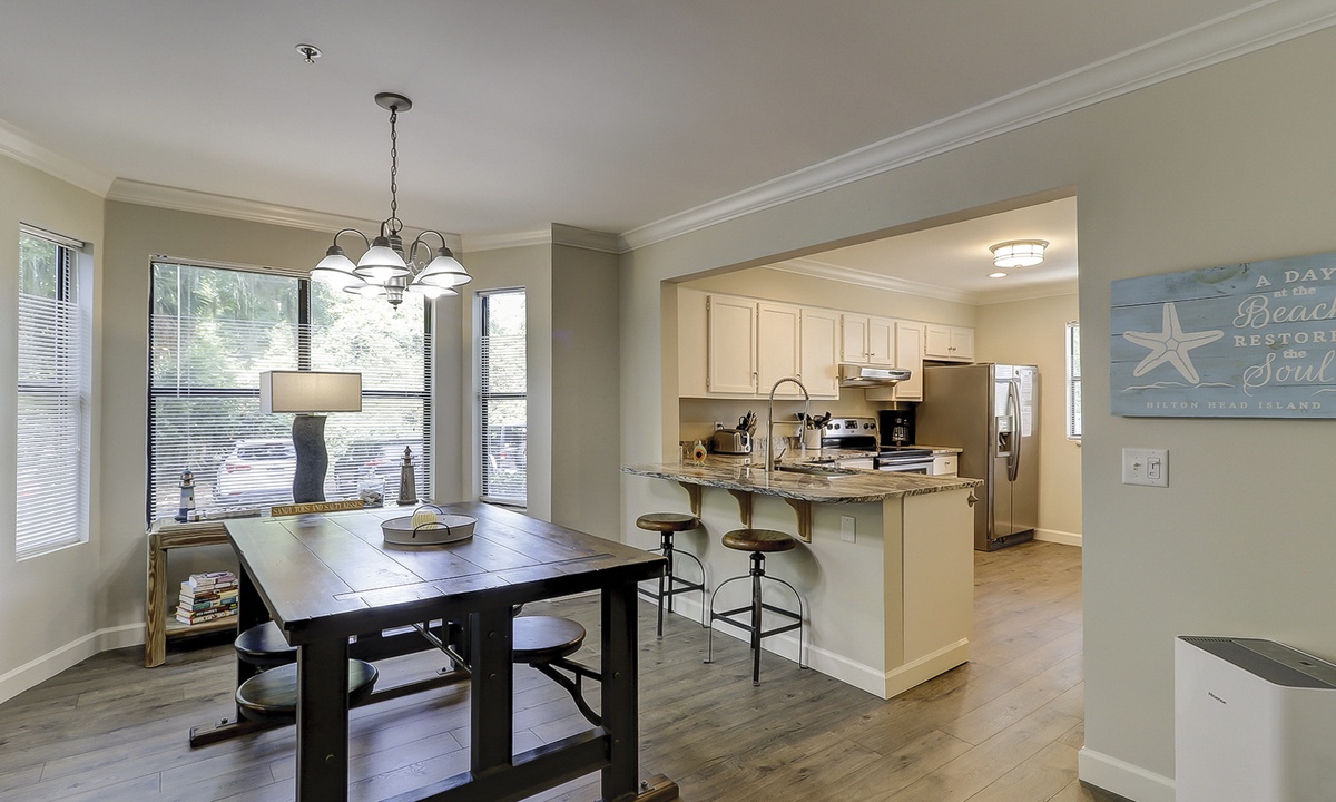 This elevated 1st floor Treetops Hilton Head villa features an open concept floor plan with brand new wood flooring and furnishings throughout. The living area features a new smart TV, a large and comfortable sleeper sofa, as well as access to the private screened in porch. The screened in porch features a bistro table and porch swing, perfect for lounging. The dining area features seating for 4 with an additional 2 seats at the kitchen bar. The updated kitchen features granite countertops, new stainless steel appliances and plenty of cabinet space.
