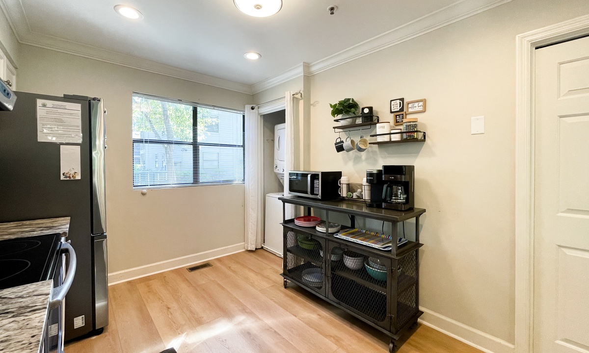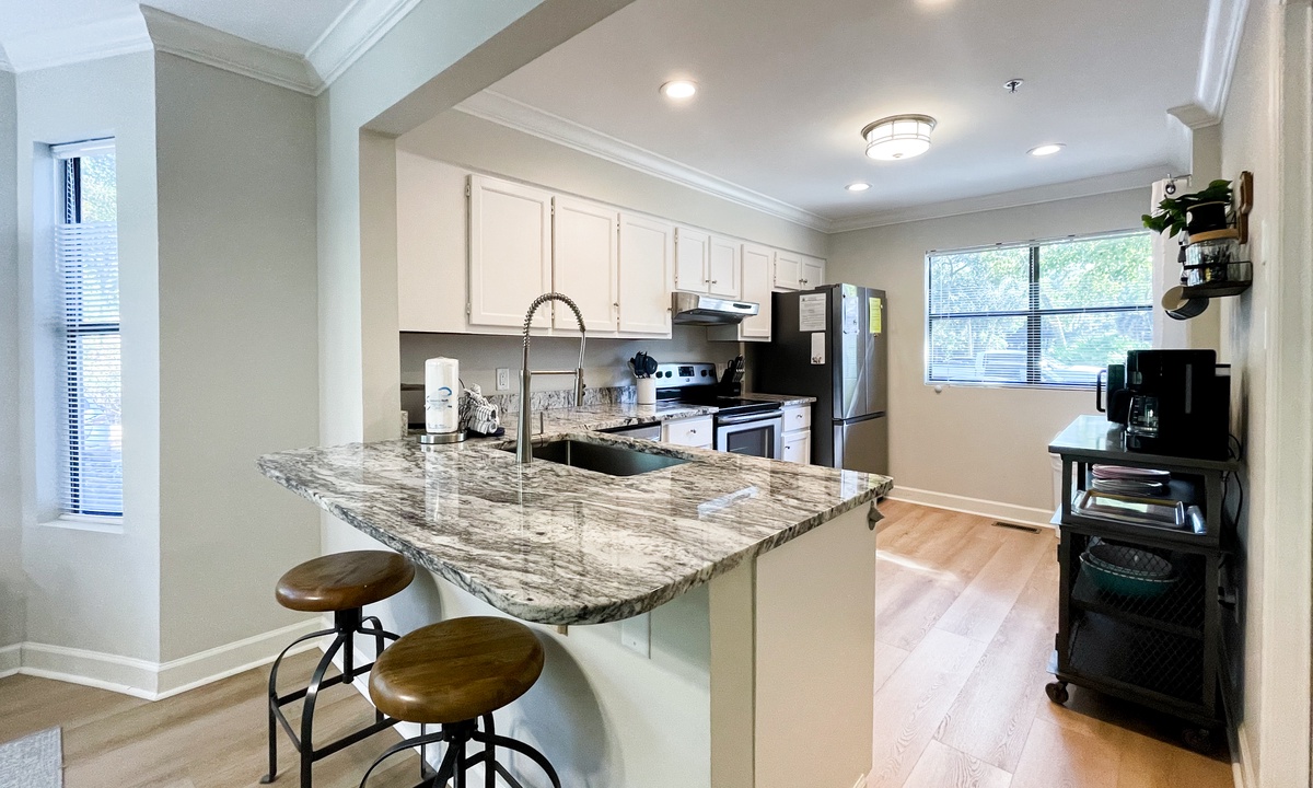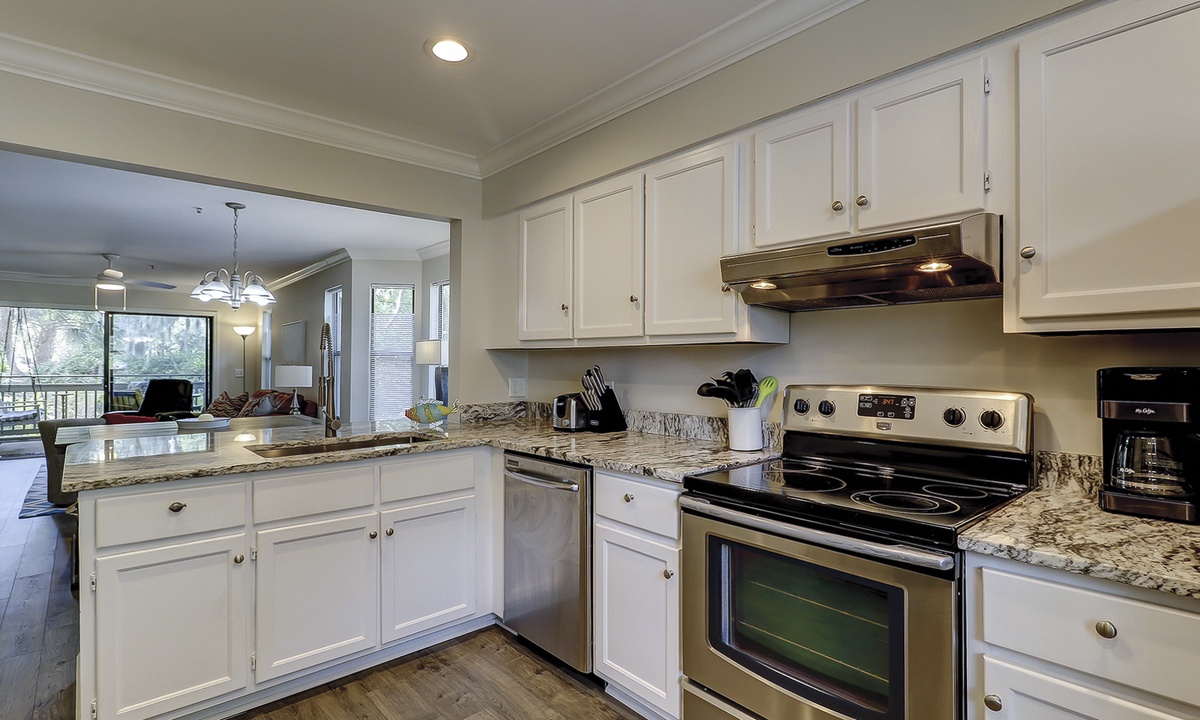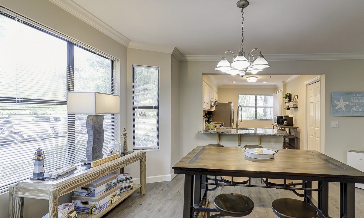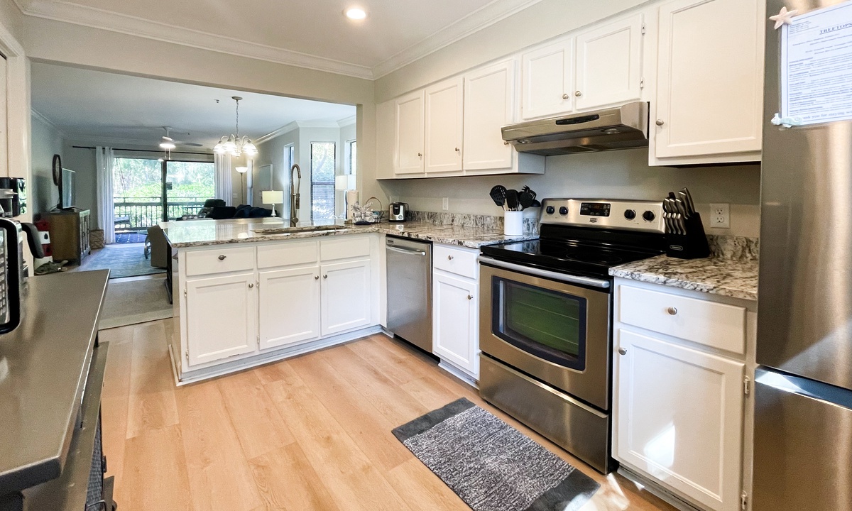 This elevated 1st floor Treetops Hilton Head villa features an open concept floor plan with brand new wood flooring and furnishings throughout. The living area features a new smart TV, a large and comfortable sleeper sofa, as well as access to the private screened in porch. The screened in porch features a bistro table and porch swing, perfect for lounging. The dining area features seating for 4 with an additional 2 seats at the kitchen bar. The updated kitchen features granite countertops, new stainless steel appliances and plenty of cabinet space.