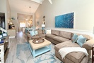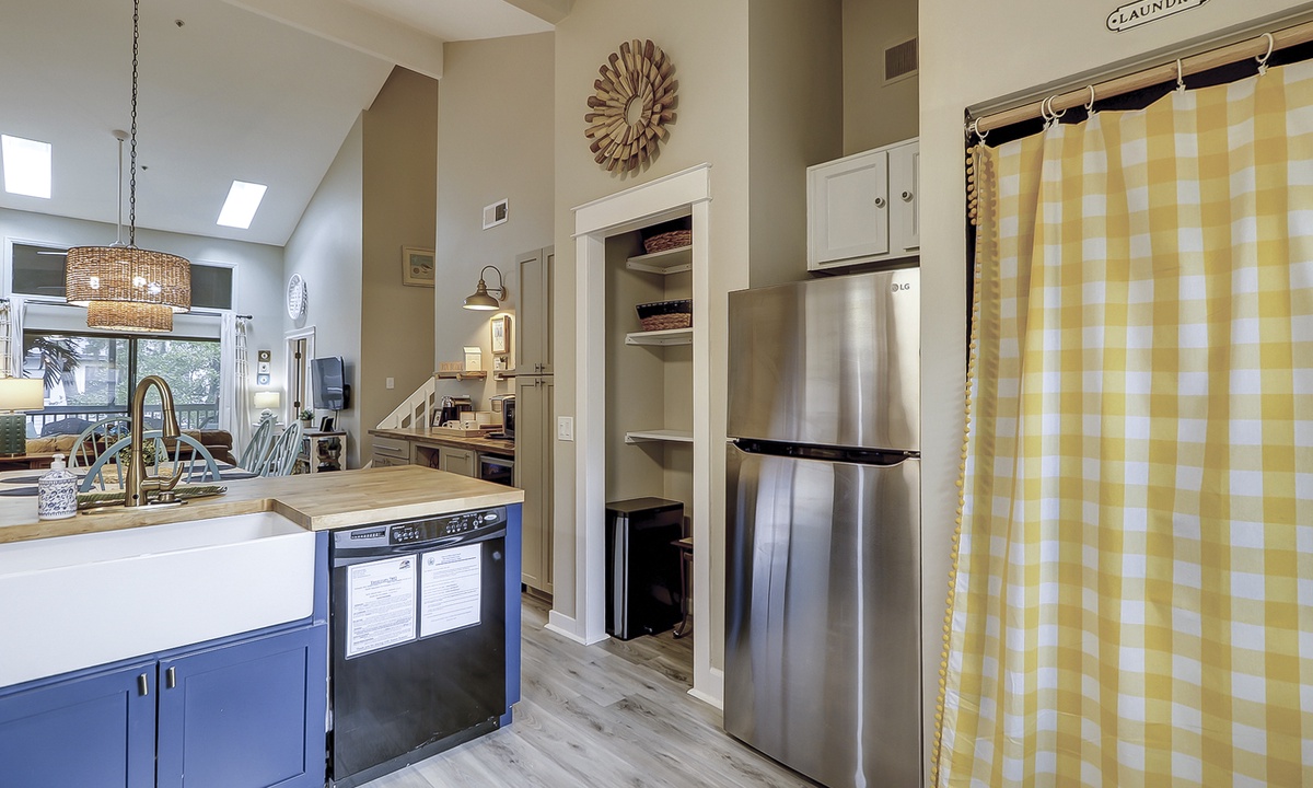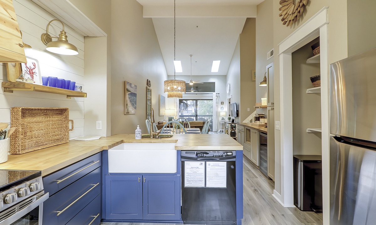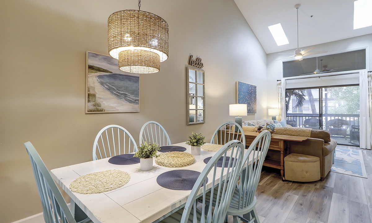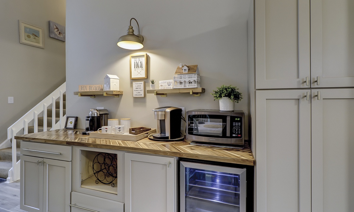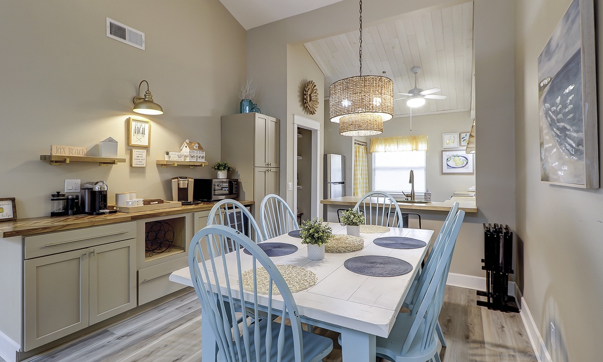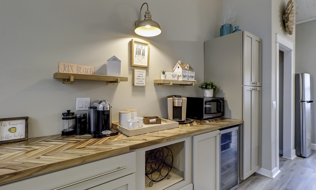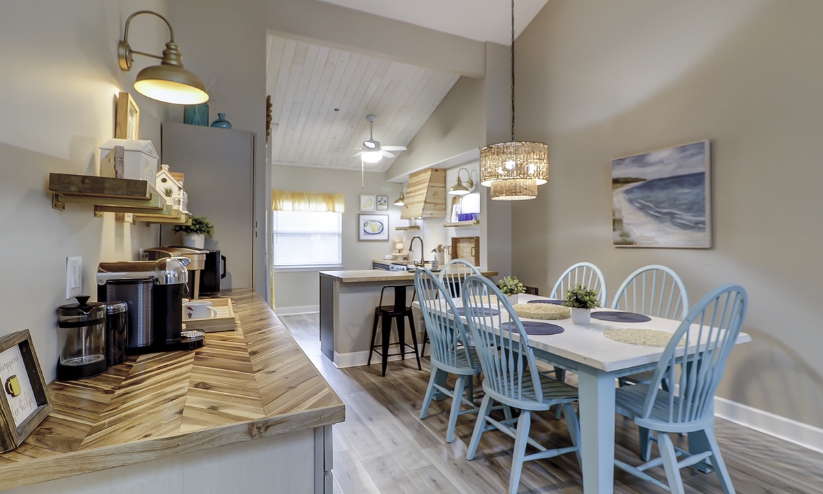 The living area is outfitted with a comfortable sectional, Smart TV and access to the private screened-in porch. The dining area seats 6 comfortably with additional dining chairs for 2 and 2 stools at the kitchen bar. Just beyond the dining area is the custom coffee bar with a 12-cup coffee maker, Keurig, Nespresso and a coffee grinder. There's also an additional beverage fridge.
