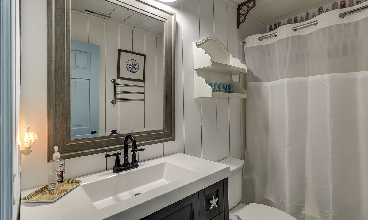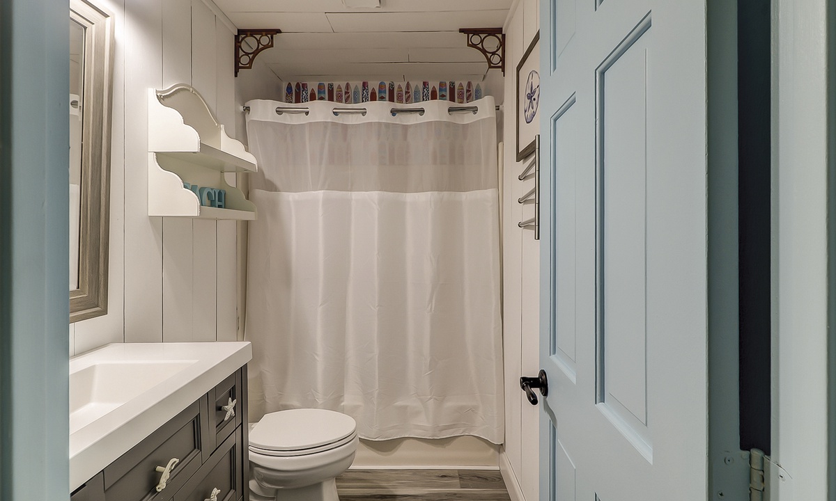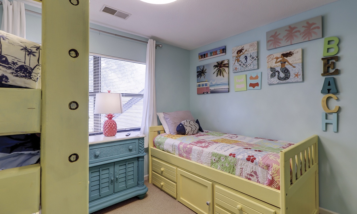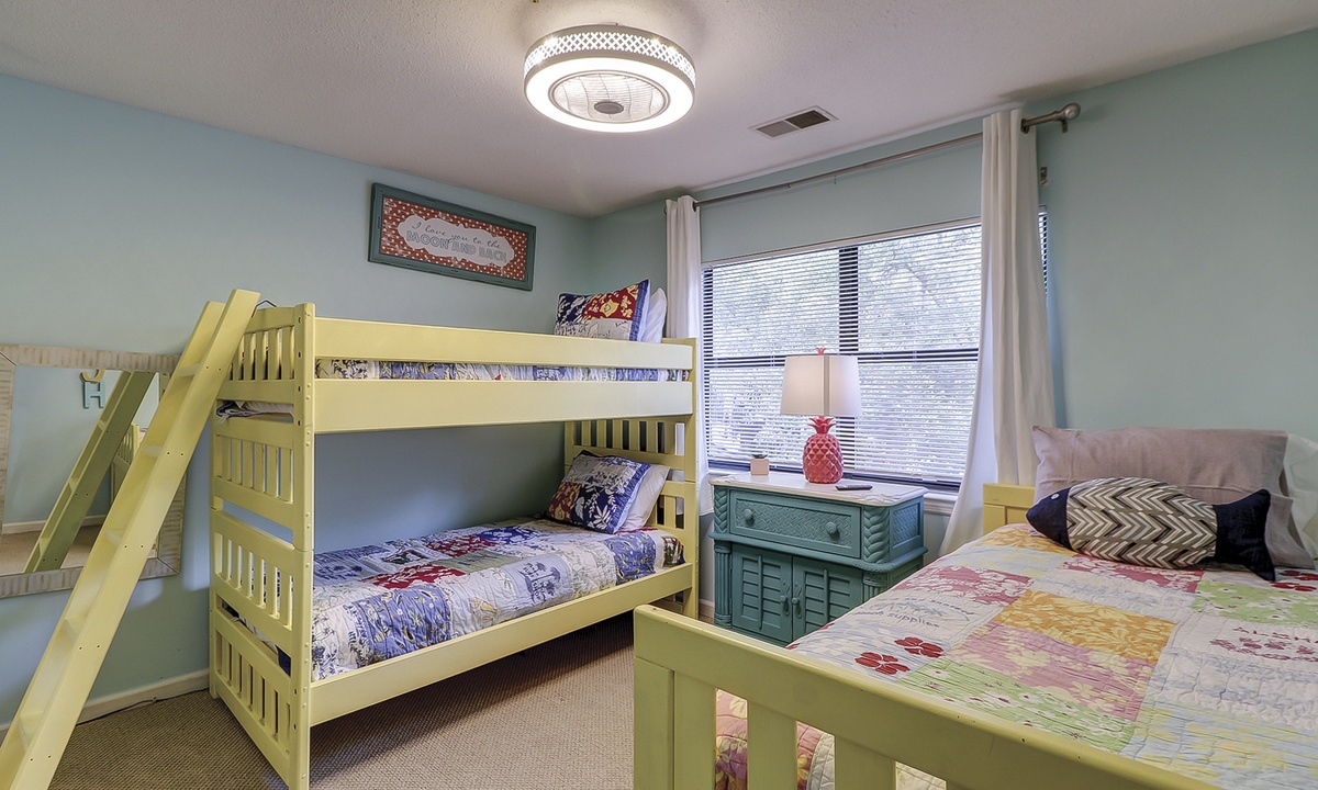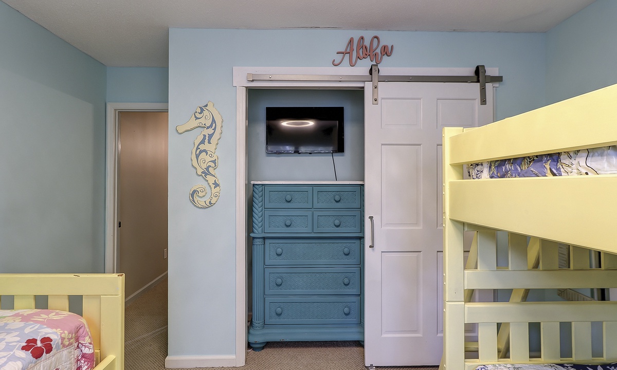 Up the stairs you'll find the kid zone! This room features a bunk bed, twin bed and a Smart TV. This room has access to a hall bath with a tub/shower combination.
