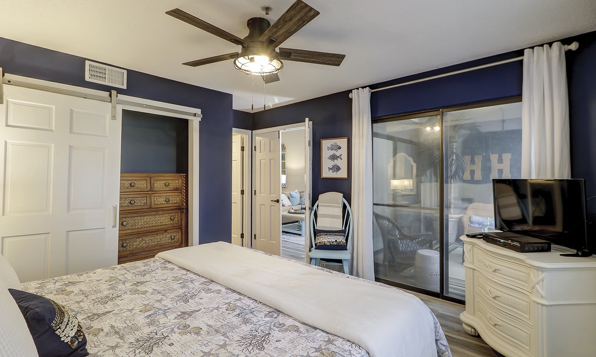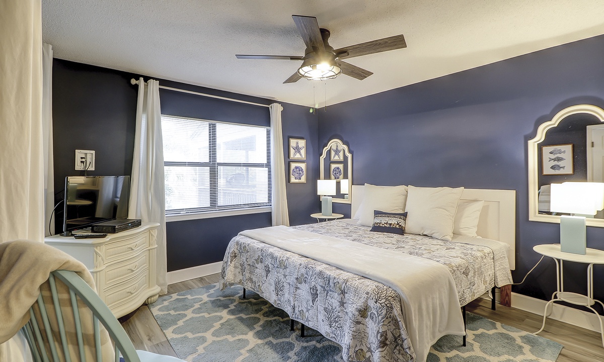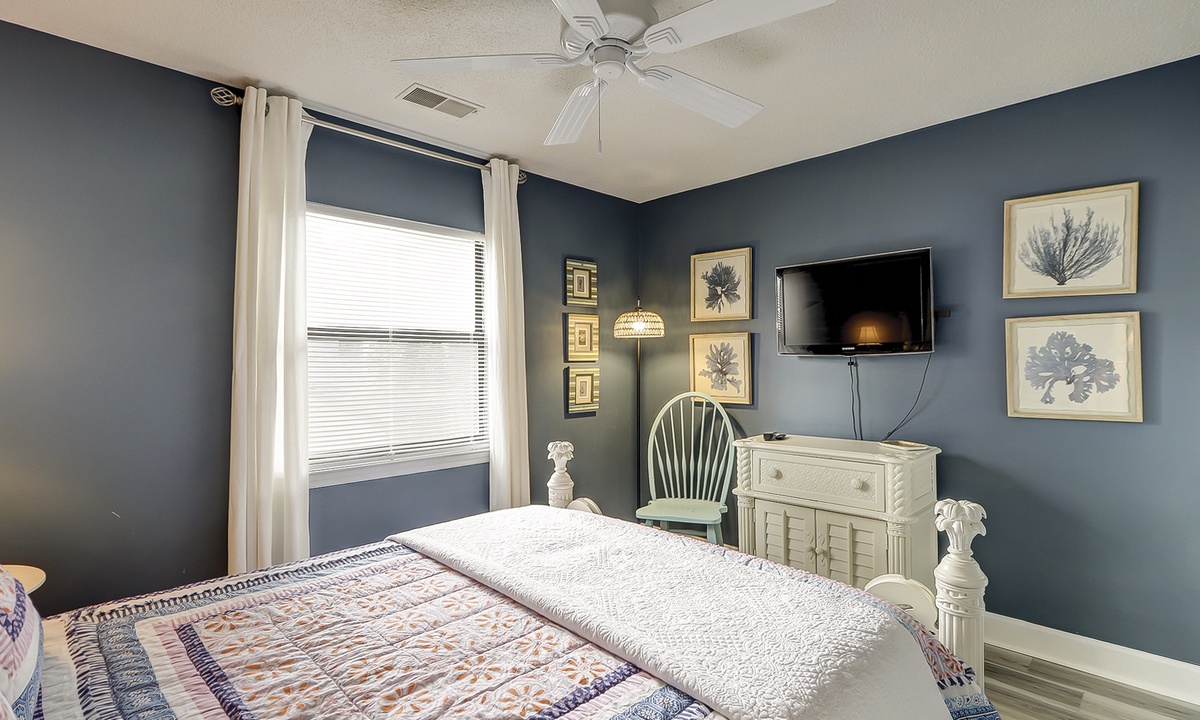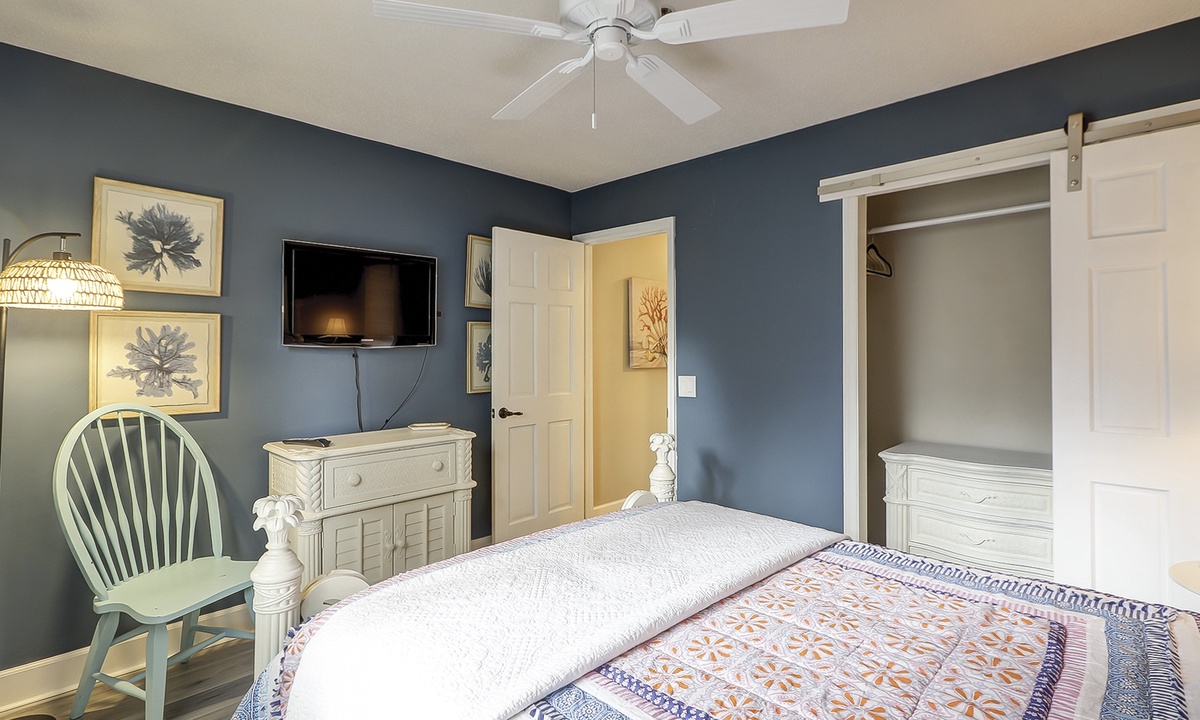 The queen guest bedroom is also located on the main level. This room has a Smart TV and access to a hall bathroom with a walk-in shower.