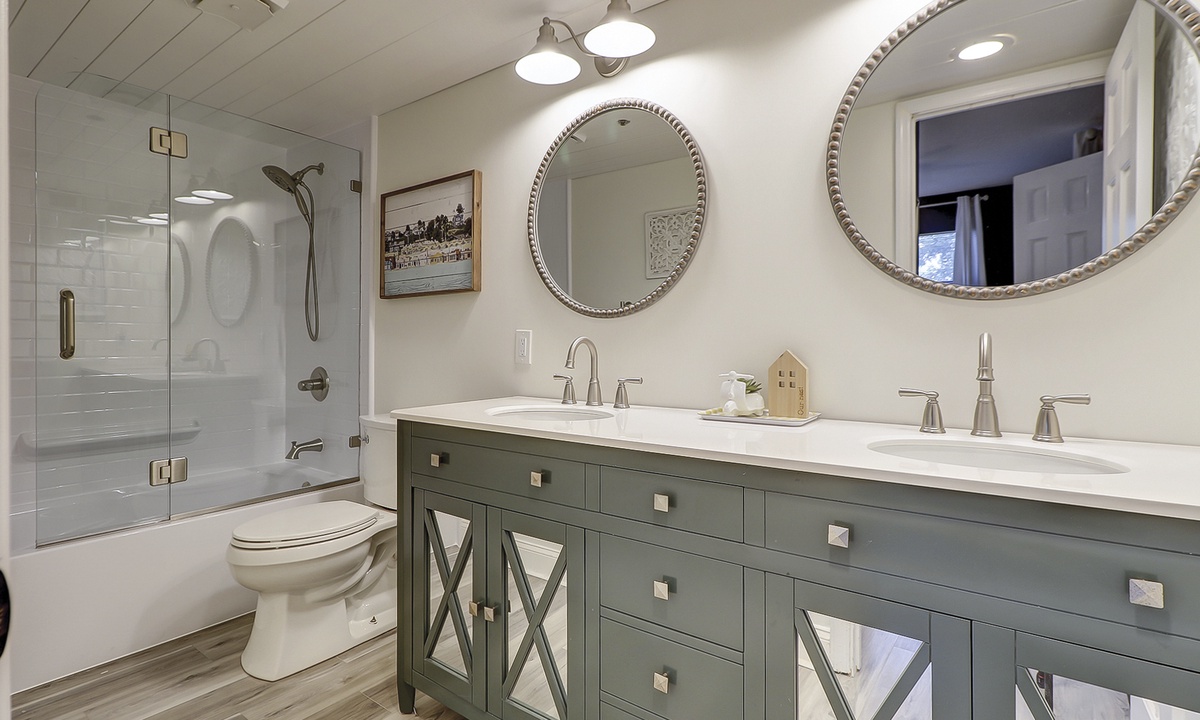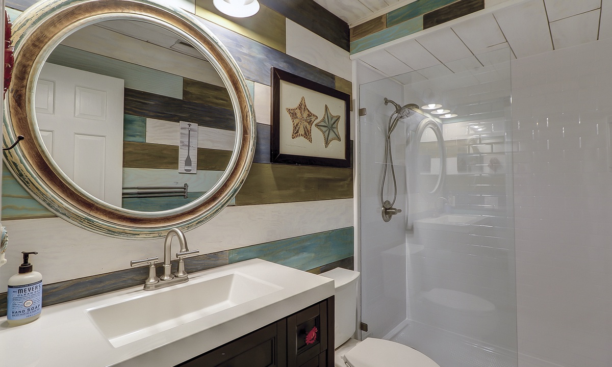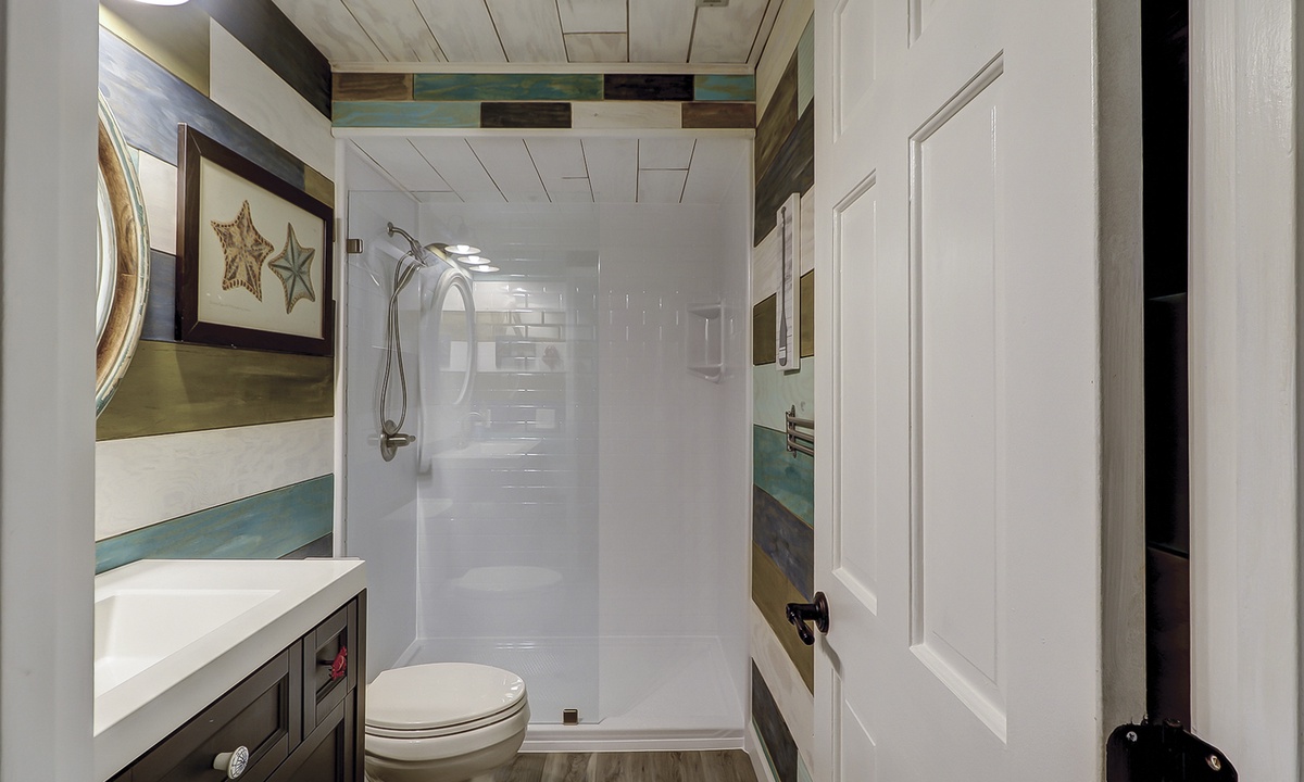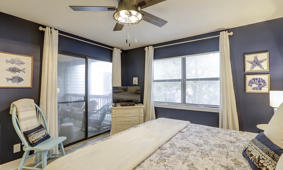 The queen guest bedroom is also located on the main level. This room has a Smart TV and access to a hall bathroom with a walk-in shower.