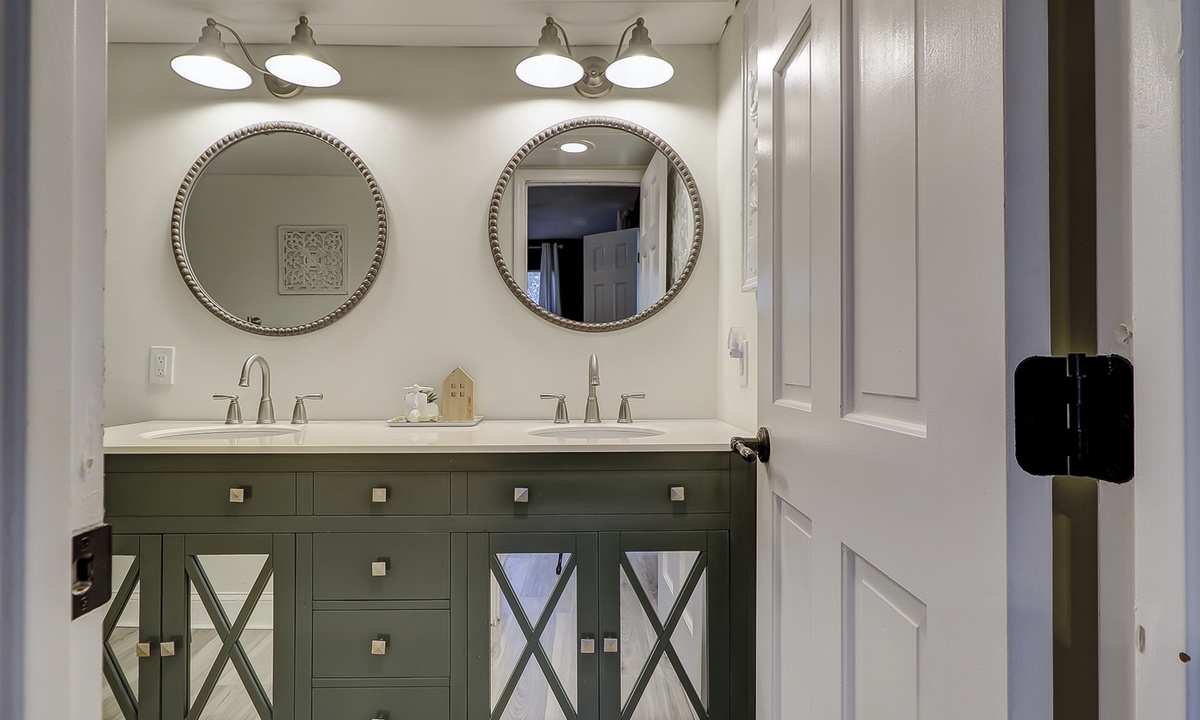 The main bedroom is located off the living area. This room features a king bed, Smart TV and access to a private bathroom with dual sinks and a tub/shower combination.