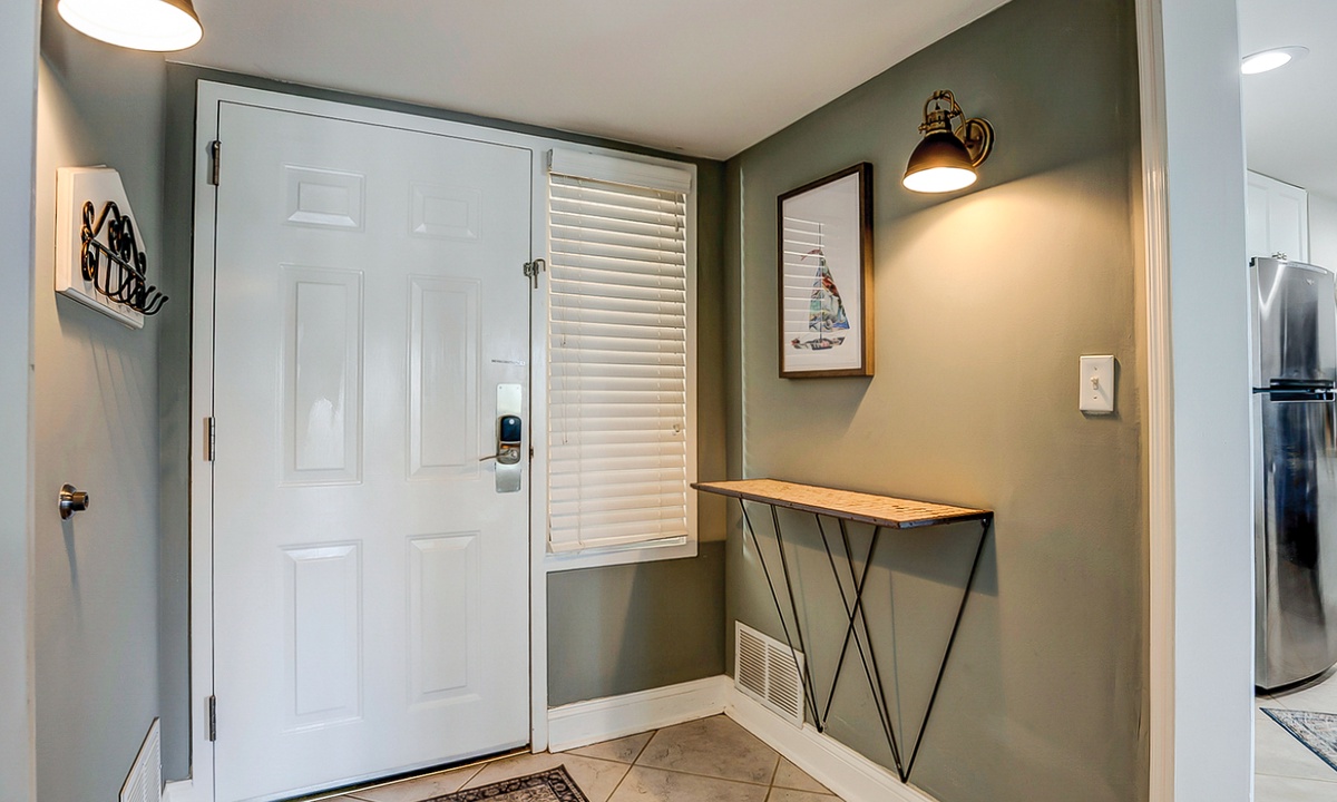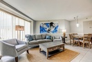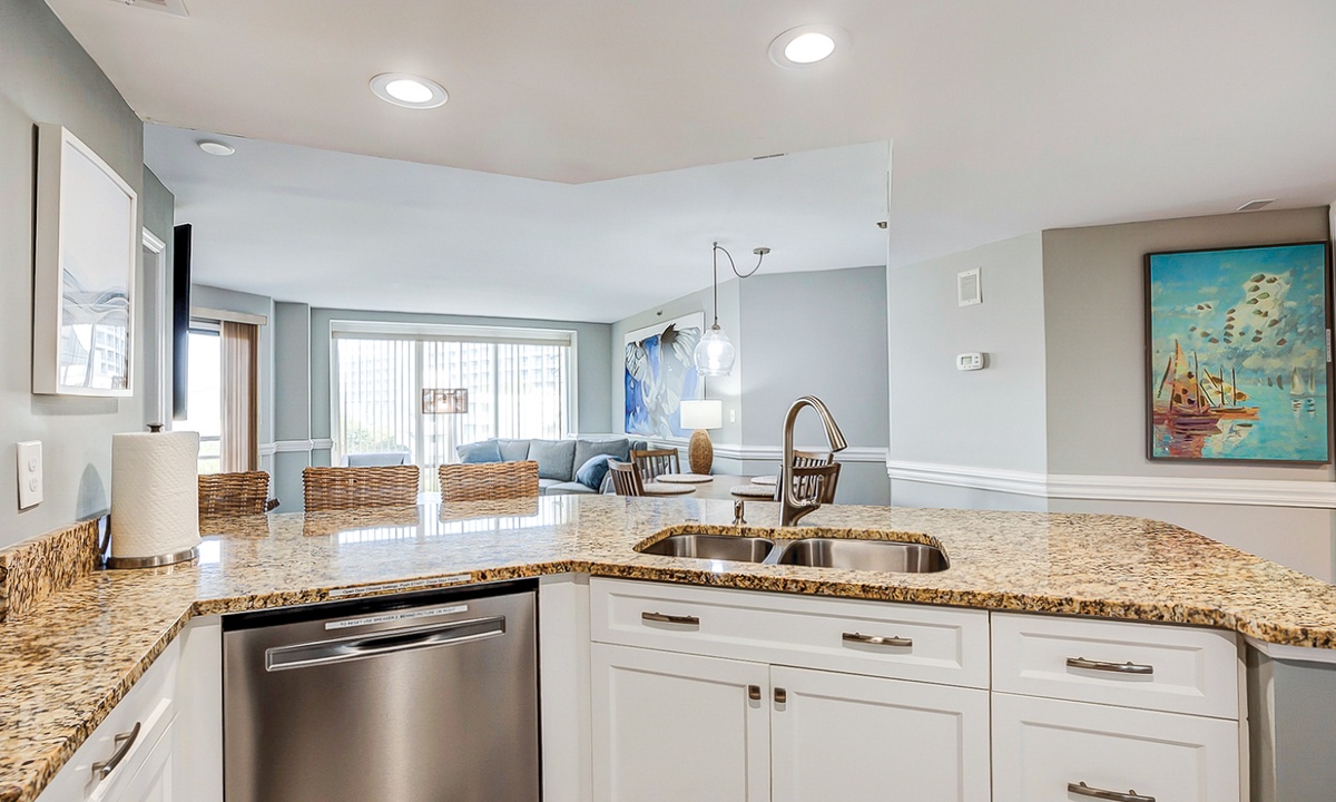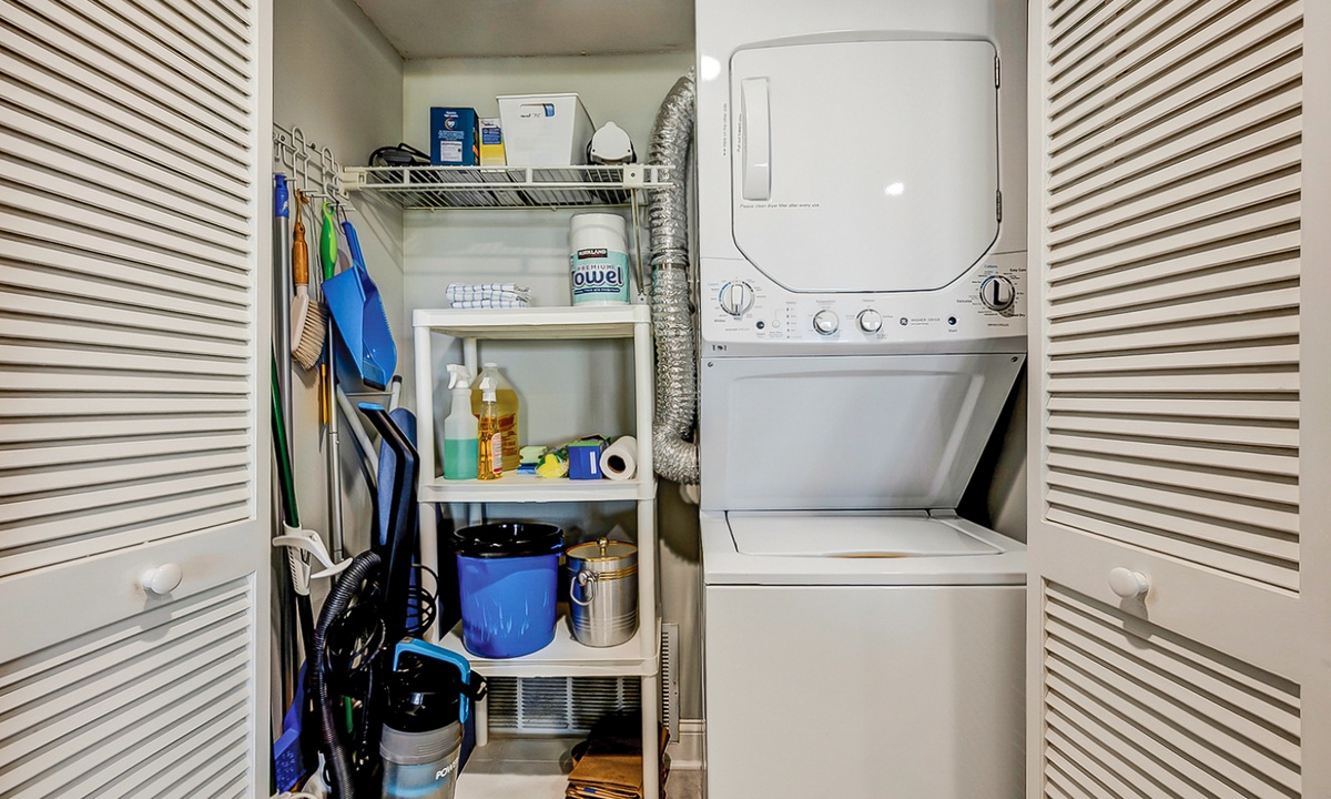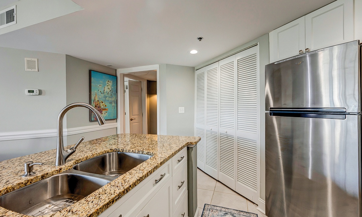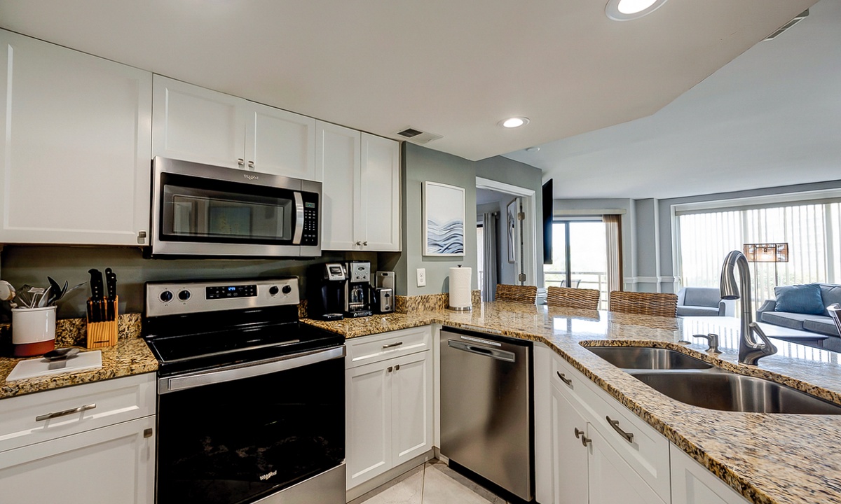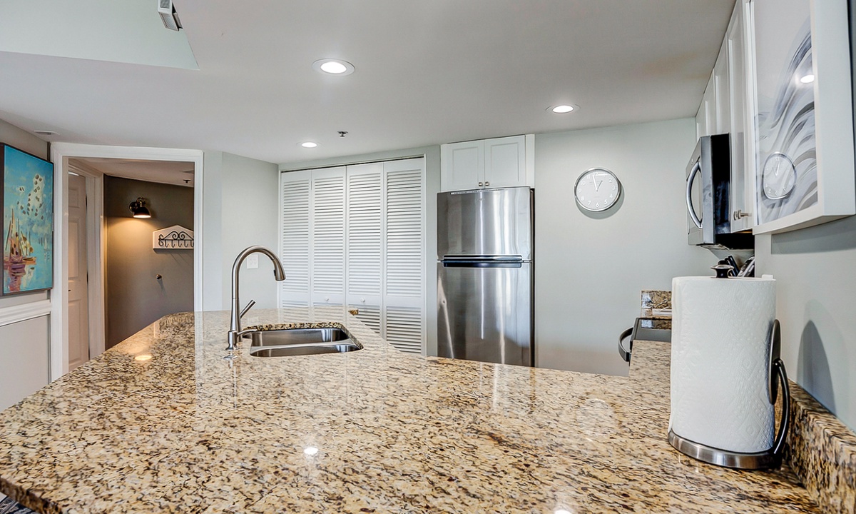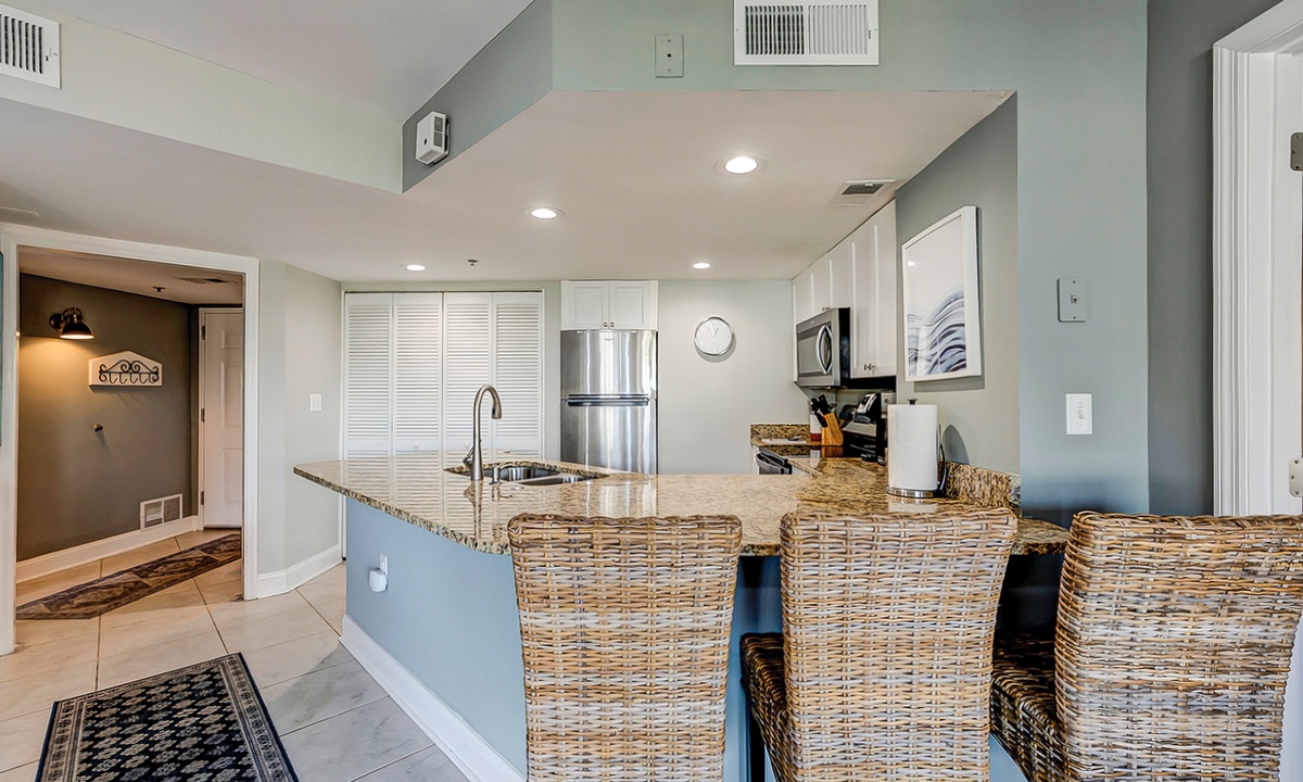 The dining area seats 4 with additional seating for 3 at the kitchen bar. The well-stocked kitchen has granite counters, stainless-steel appliances and a stackable washer and dryer.