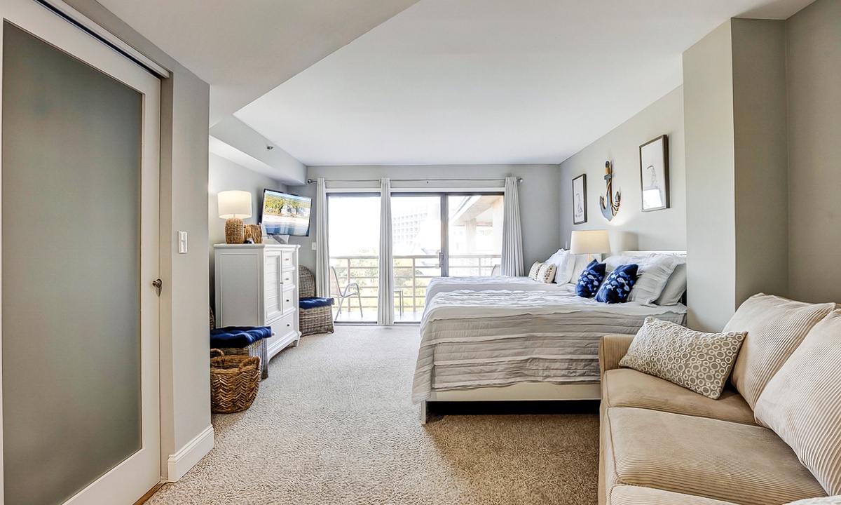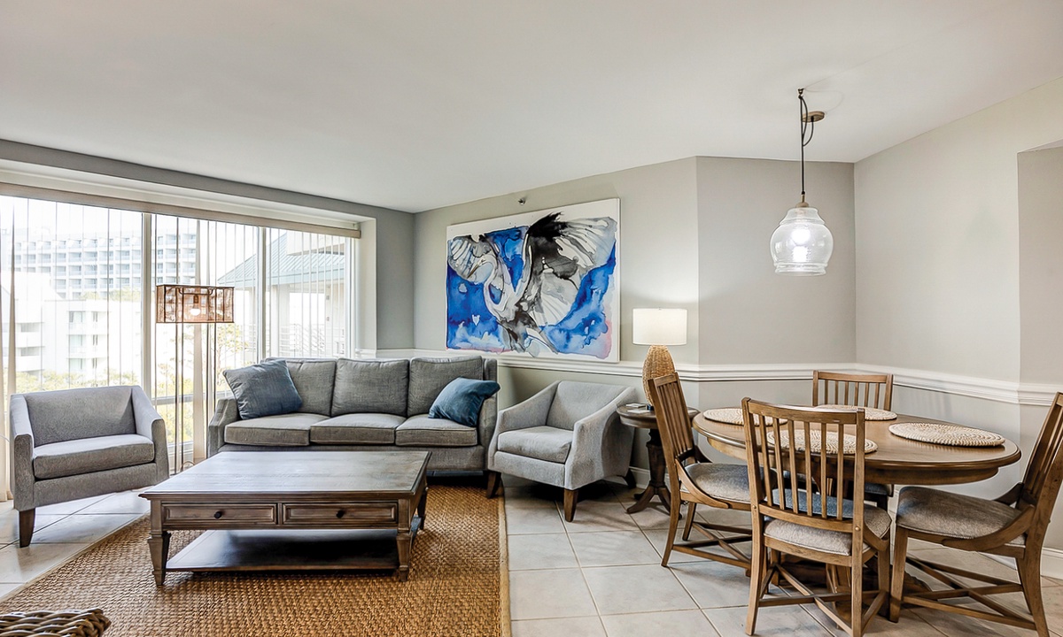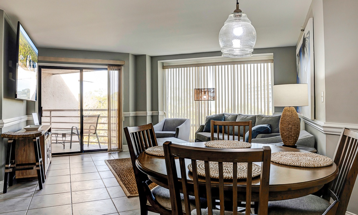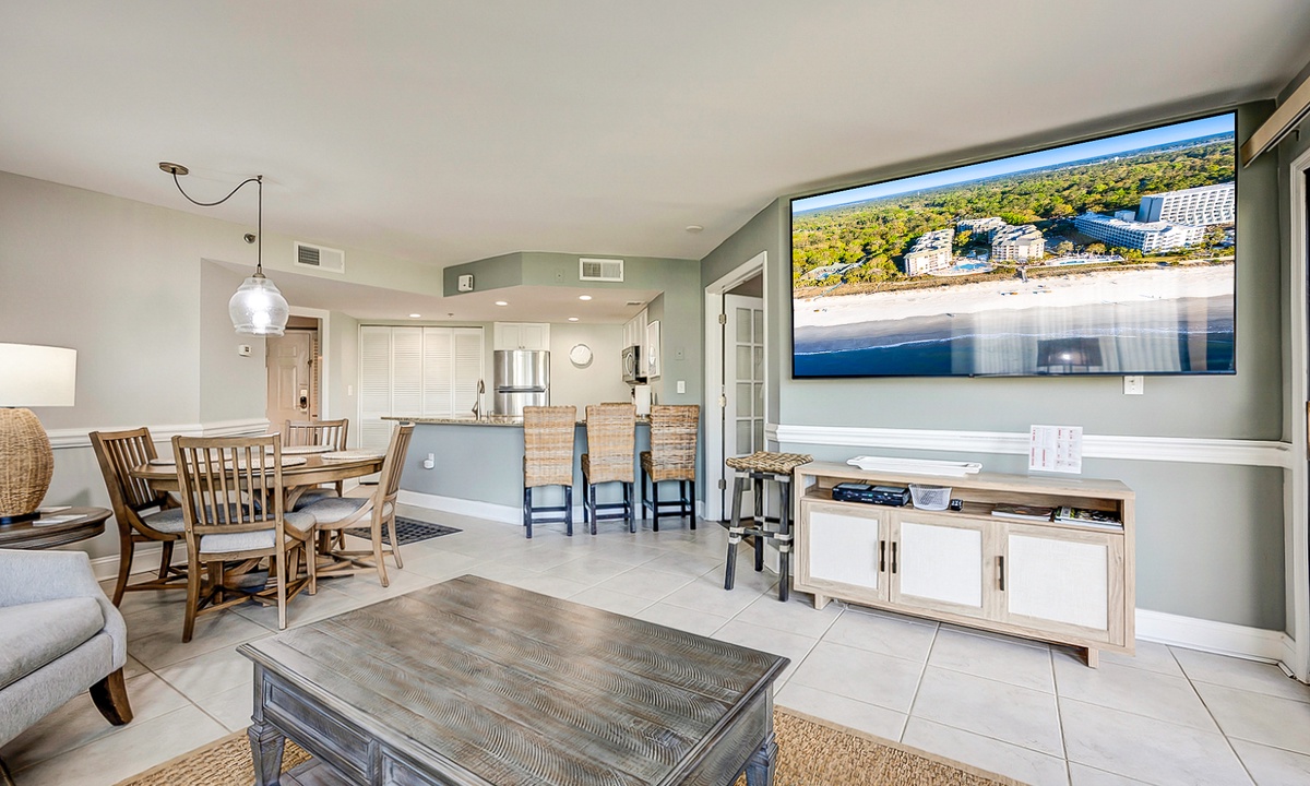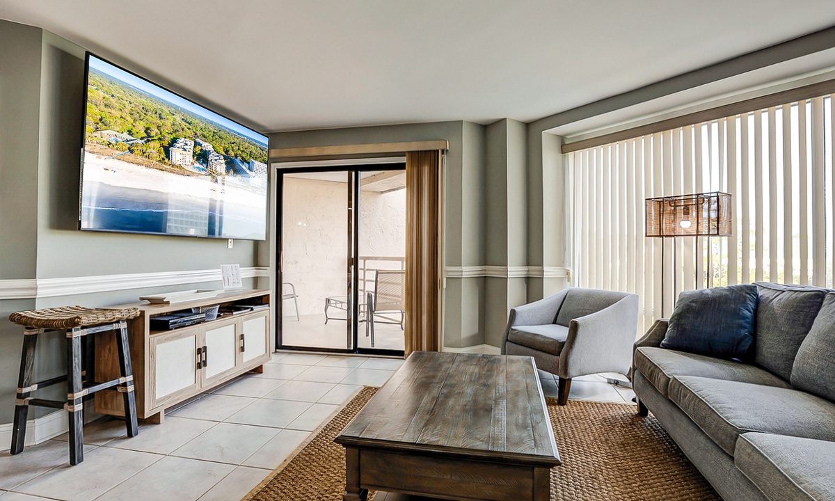 The open-concept floor plan offers white tile flooring throughout and fanstastic island views. The living area features comfortable furnishings, a wall-mounted TV and access to the private covered balcony.