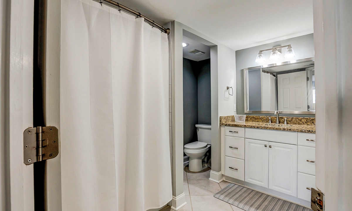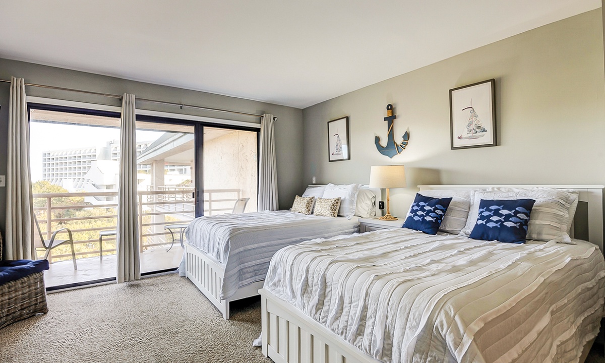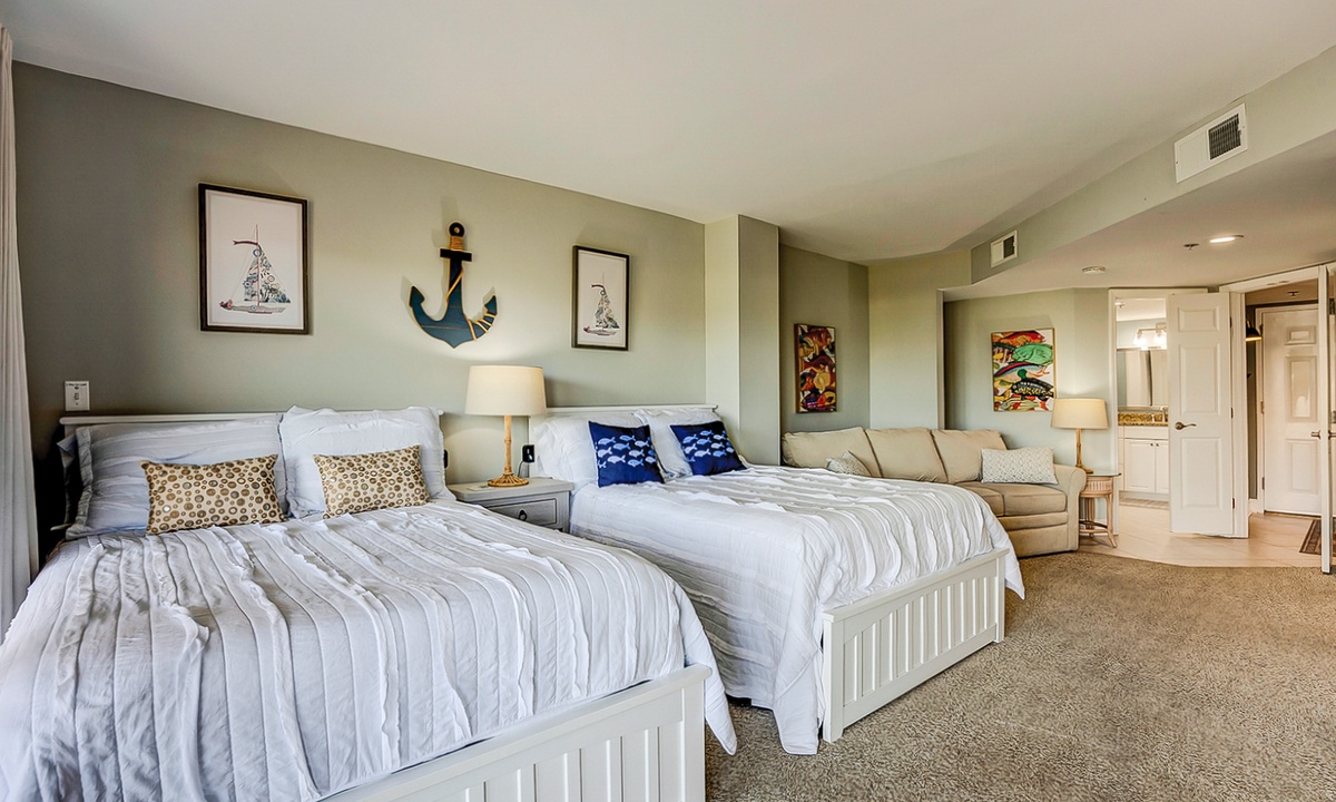 On the opposite side of the condo you'll find the guest suite. This room has two full beds, a flat screen TV and a seating area with a loveseat and two chairs. This room also has a private, covered balcony with two rocking chairs. The private bathroom is equipped with a tub/shower combination.