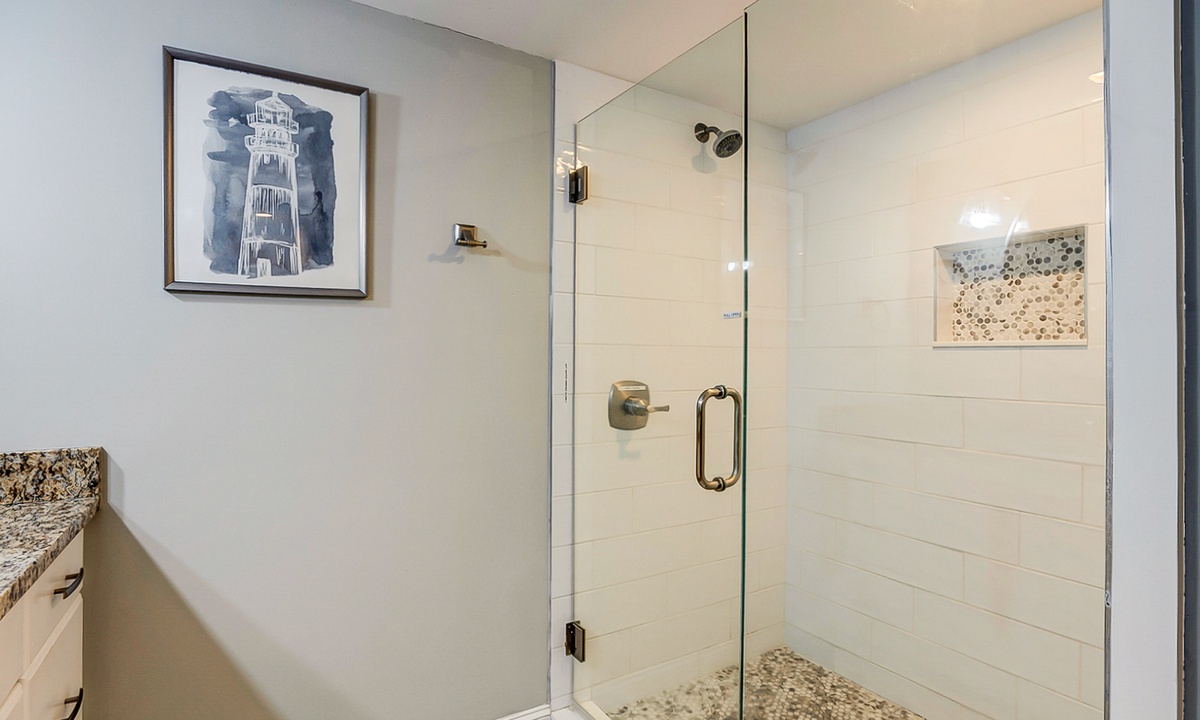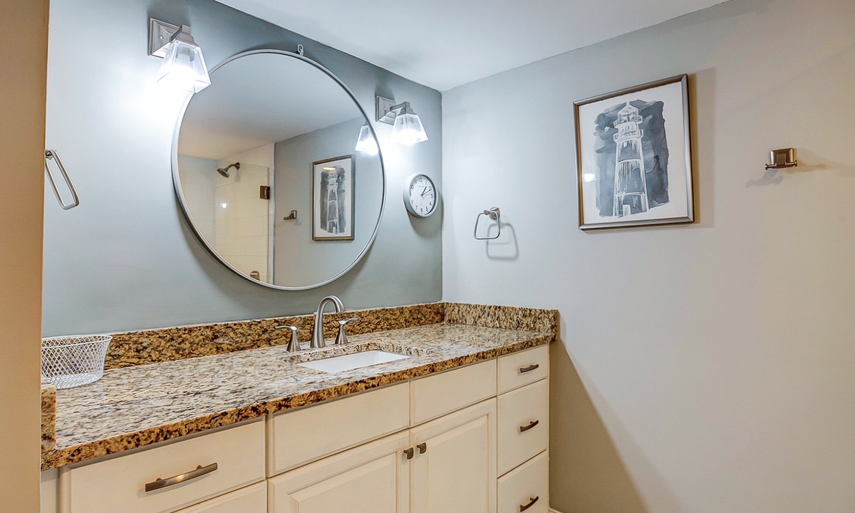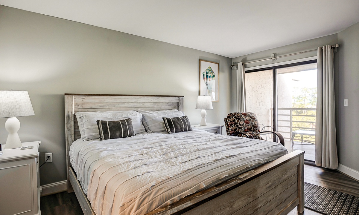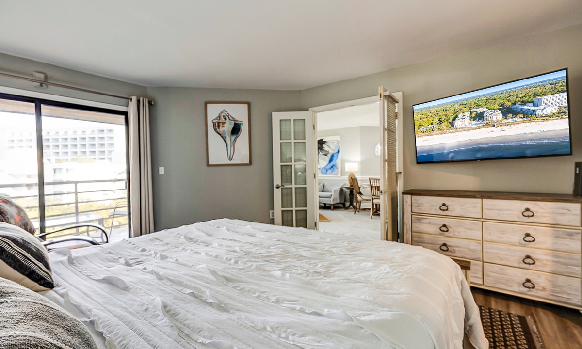 The main bedroom is located just off the living area through French doors. This area has a king bed, wall-mounted TV and a sliding door leading to the balcony shared with the living area. The private bathroom has a granite top vanity and a large walk-in shower.